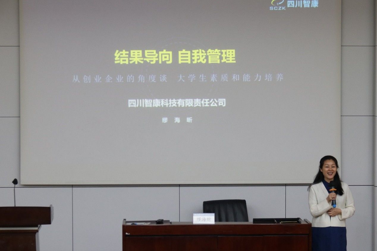 接着,缪海昕通过讲述四川智康科技有限责任公司的创立和发展过程,分享了自己作为创业者的亲身经历,使同学们能够更加真切地感受到企业成长的挑战与机遇。她详细阐述了企业从初创到成熟各个阶段对人才的差异化需求,以及这些需求如何影响大学生应培养的素质和能力。
