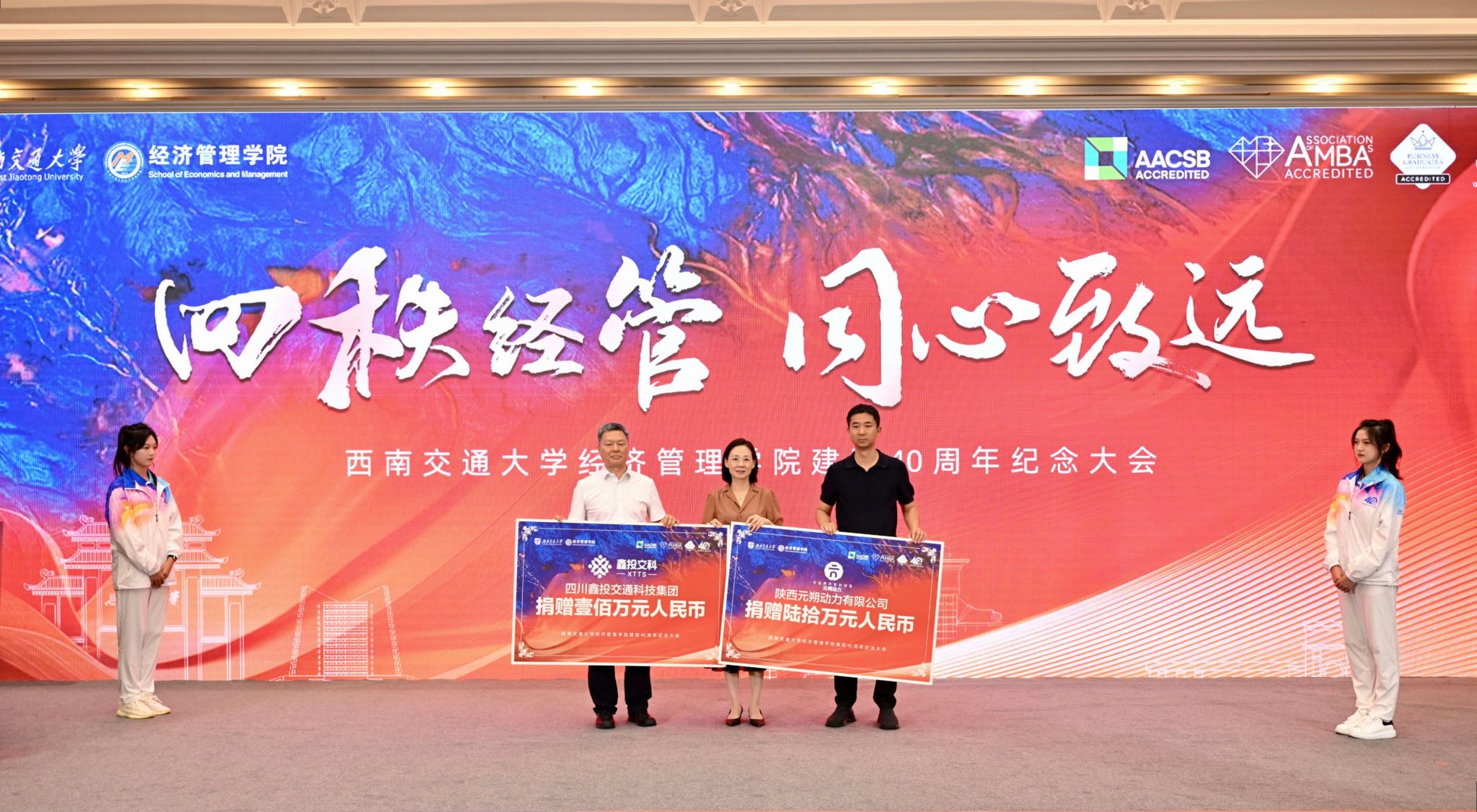 为凝聚校友力量,值此建院四十周年之际,学院特设立“bat365官网登录入口发展基金”,受到了广大校友的广泛支持。捐赠仪式上,学校党委副书记杨爱华代表学校接受捐赠,并为四川鑫投交通科技集团总经理李勇、陕西元朔动力有限公司董事长黄福臣颁发捐赠赠书。捐赠人李勇在发言中谈到,交大bat365人是鑫投交通科技集团最为重要的管理力量,他代表集团为学院四十周年华诞送上诚挚祝福。捐赠人黄福臣在发言中谈到,交大老师们严谨认真、求真笃实,学生们独立思考、追求卓越的优秀学风为他的从商之路奠定了坚实基础,祝愿交大bat365学院的未来更加辉煌。“西南交通大学bat365官网登录入口发展基金”寄托了所有捐赠人、广大校友、社会各界对交大bat365实现新发展、开辟新局面的殷切期盼,所筹款项将用于建院四十周年纪念系列活动,学院教学、科研、人才培养等未来长远发展。