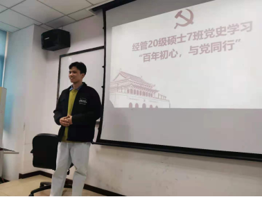 2021年时中国共产党成立100周年,立足党的百年历史新起点,面对中华民族伟大复兴战略全局和世界百年未有之大变局,为加强团员们的思想政治教育工作,树立正确党史观,贯彻落实精神文明建设,bat365学院2020级硕士第七团支部于2021年4月19日19:30在0号教学楼0316教室开展了“百年初心,与党同行”的开学第一堂团课。