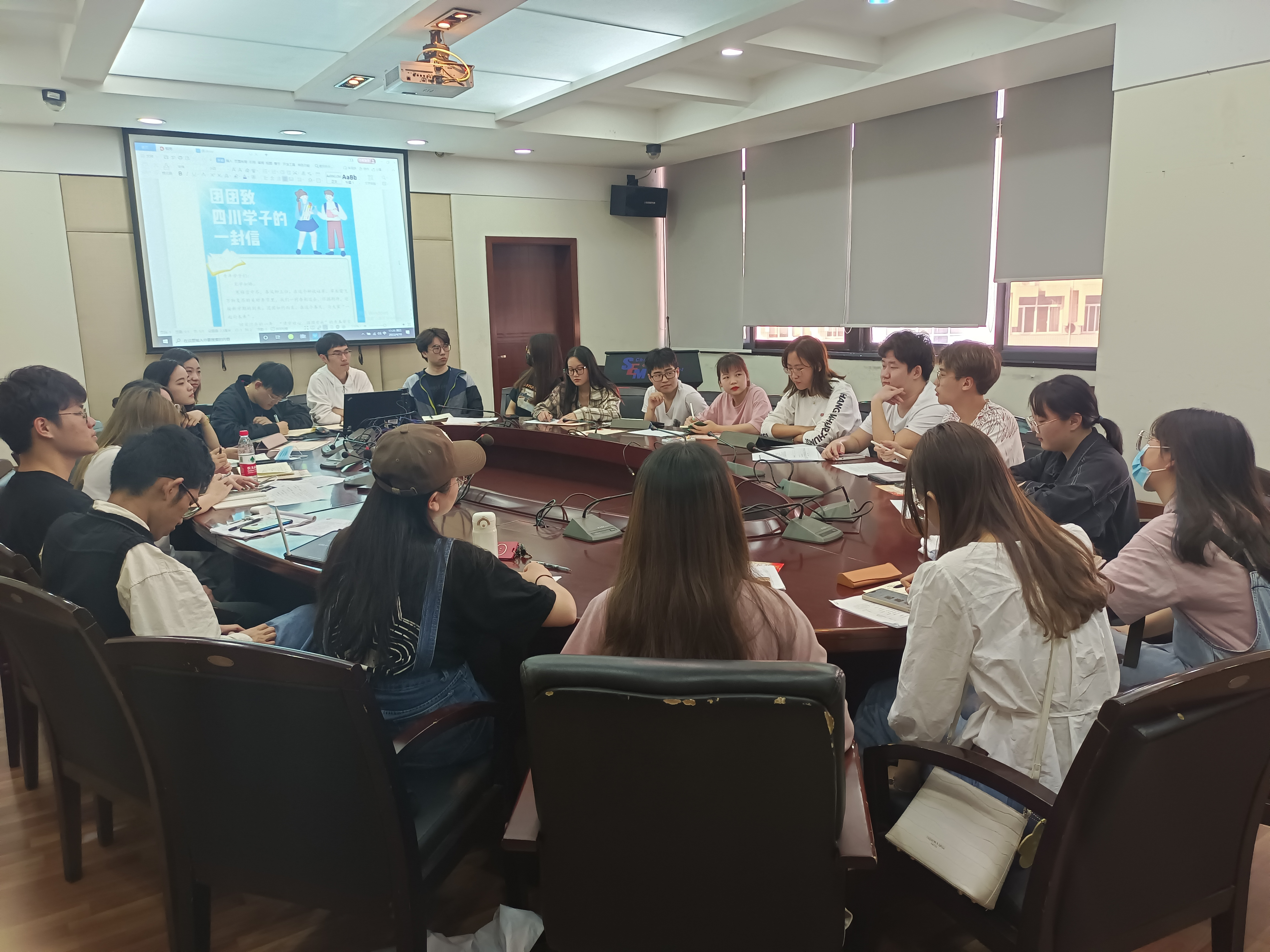 本次会议围绕“学生会干部学习和工作总结”来开展,由苏扬主持开展。会议伊始,苏扬带领学生会全体干部共同学习了《团团致四川学子的一封信》和《学生会系列活动方案》,着重强调规定动作和自选动作要结合开展,活动内容要紧密联系时代主题。