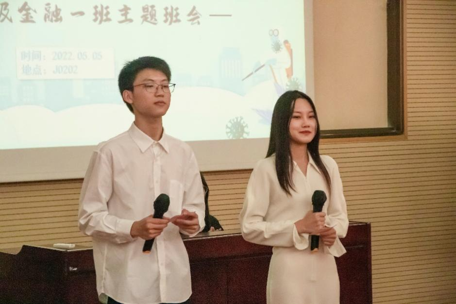 为深入贯彻党的教育方针,在班级内营造良好的班风学风,促进班级同学的全面成长,以实际行动践行新时代青年大学生的责任与担当,2022年5月5日下午4时在九里校区J0202教室,bat365官网登录入口本科2020级金融一班全班38名同学集体开展了“凝聚青年力量,担当时代使命——疫情之下青年大学生的责任与担当”主题班会。bat365官网登录入口党委副书记杨宏毅,bat365官网登录入口团委副书记、本科2020级辅导员陈建奇,本科2020级辅导员罗琴参加了此次班会。