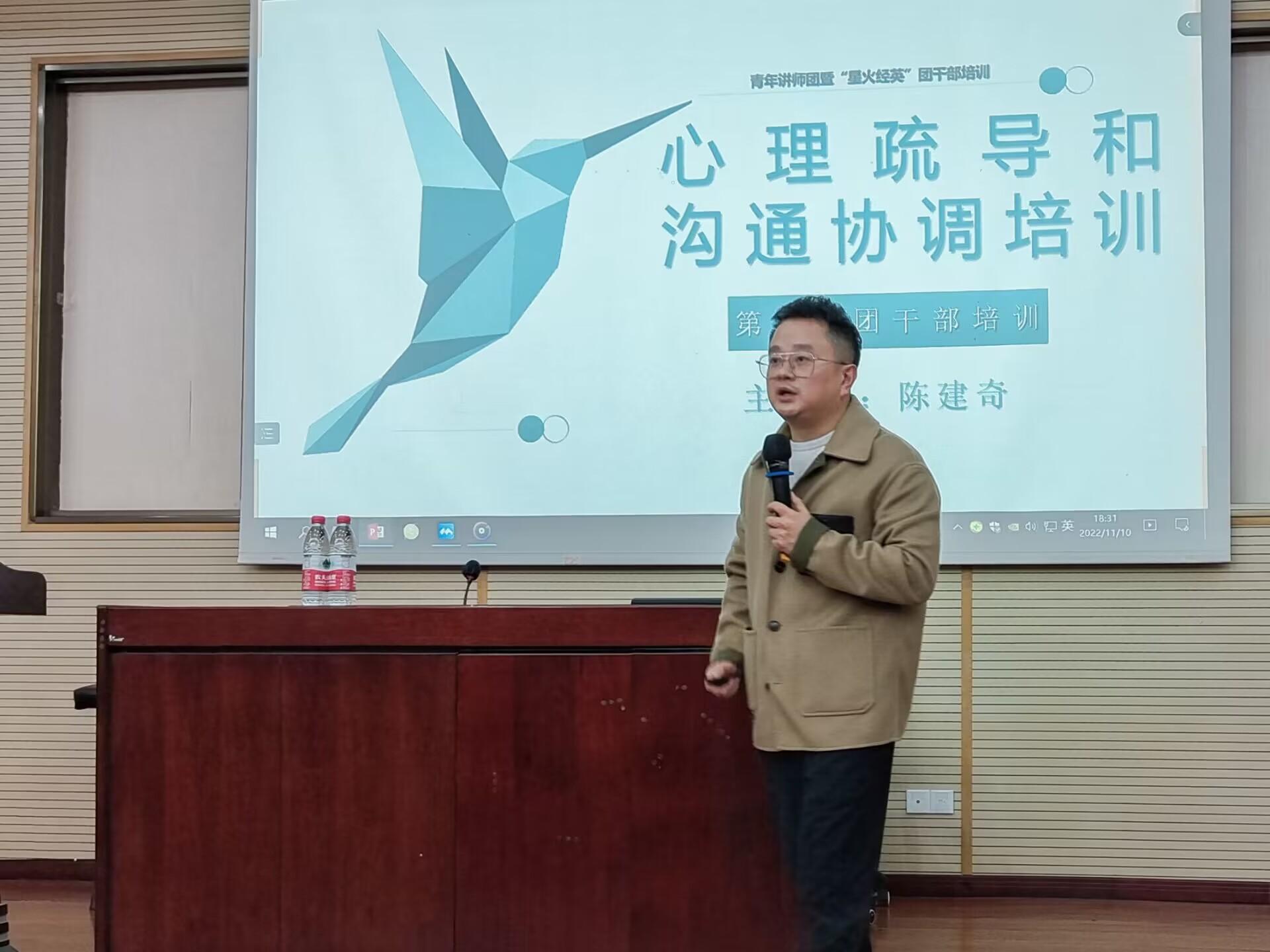 2022年11月10日晚,bat365官网登录入口于J0202教室开展了“星火经英”计划第十期第八次团干部培训,本次培训由分团委副书记、bat365官网登录入口本科2020级辅导员、青年志愿者协会指导老师陈建奇主讲,培训主题为“心理疏导和沟通协调培训”,旨在让团干部们了解心理疏导,明白进行大学生心理疏导以及沟通的重要性以及如何开展。