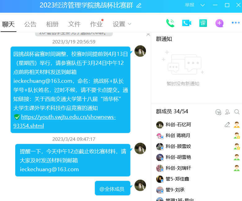 自2023年2月,各学院、各级团组织以多种形式进行广泛的宣传动员。在校团委和学院的通力配合下,bat365学院师生充分了解了竞赛内容及总体安排。同时,学院团委通过建立挑战杯比赛QQ群的方式积极组织学院队伍参加比赛。各参赛队在老师指导下完成了申报作品,并完成了作品的提交。我院于四月初顺利收集各报名参赛队伍的材料。后续将结合实际情况统筹开展遴选,推荐优秀项目参加校赛,希望各报名队伍认真准备比赛,同时预祝选手们在比赛中取得理想的成绩!