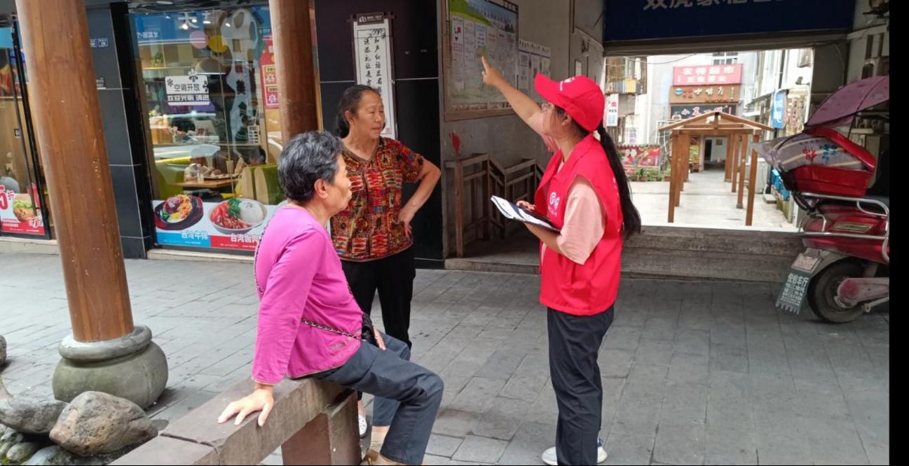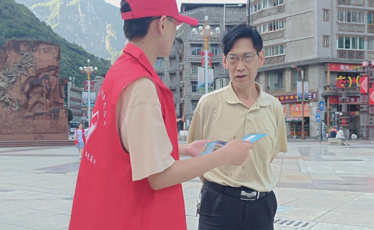 随后,在与景区负责人对接后,团队成员在红军广场布置了宣传摊位。红军广场位于景区内夹金山下,是红军长征的历史见证,也是居民休闲活动的场所。当地居民对团队的到来表示欢迎,并纷纷向队员们讲述了自己对大熊猫文化、红军文化的了解。言谈之间,队员们对这座兼收并蓄的文化之城有了更加深刻的理解。