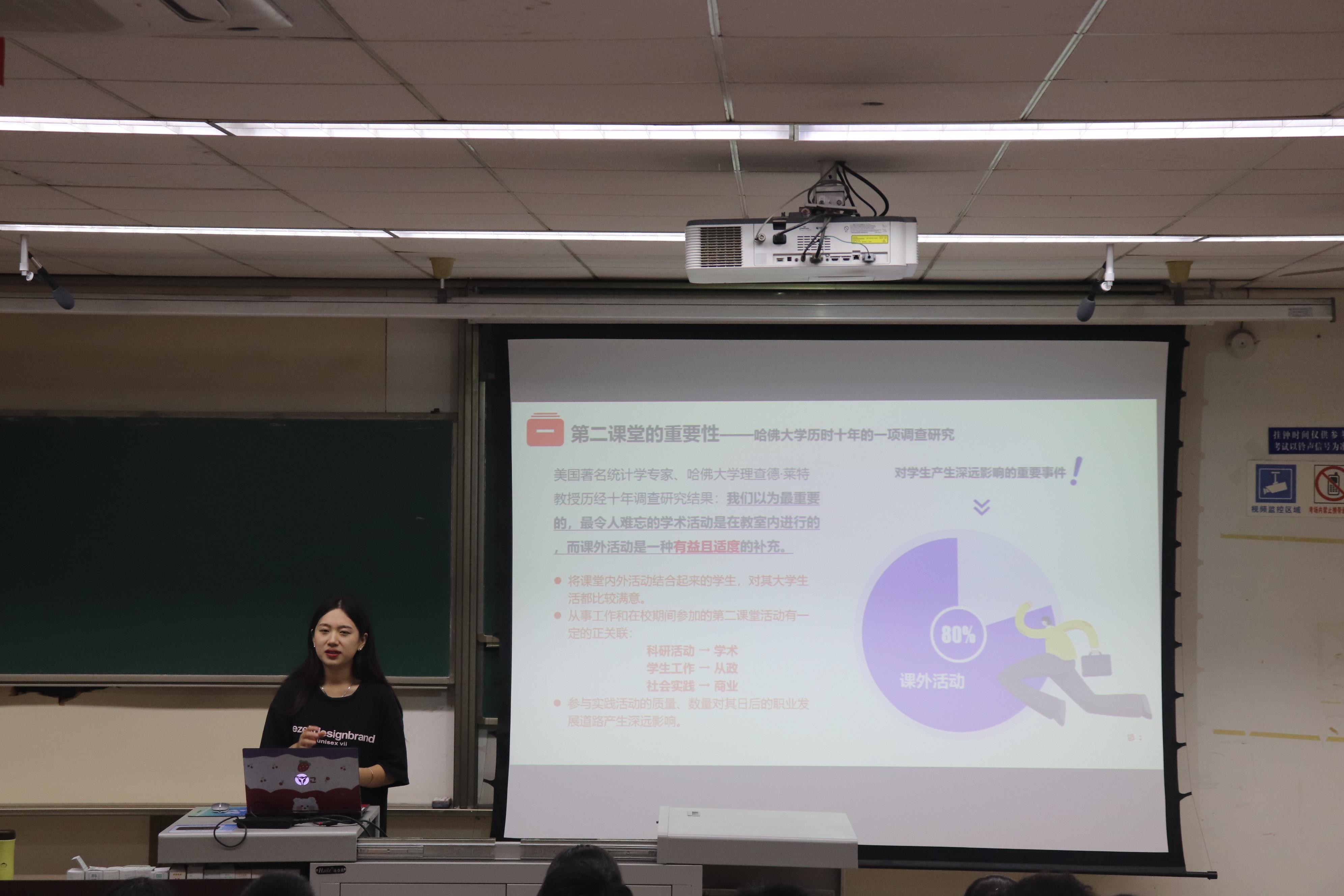 宣讲开始前,播放了一个短视频使大家能初步了解到第二课堂的基本构成,同时吸引了同学们的兴趣,使得大家在其乐融融的氛围中又不失专心致志。课件使用ppt的形式,使得大家能够第一时间拍照记录,方便了大家也使活动能够更加顺利地开展。