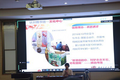 宣讲开始时,何老师以“在大学应该爱上什么”的问题进行互动并切入主题,活跃了现场气氛。然后,何老师分享了与图书馆有关的名人事例,并提到“图书馆是一个让优秀者更卓越的地方,是优秀人才聚集之所”,成功让同学们意识到了图书馆重要性。