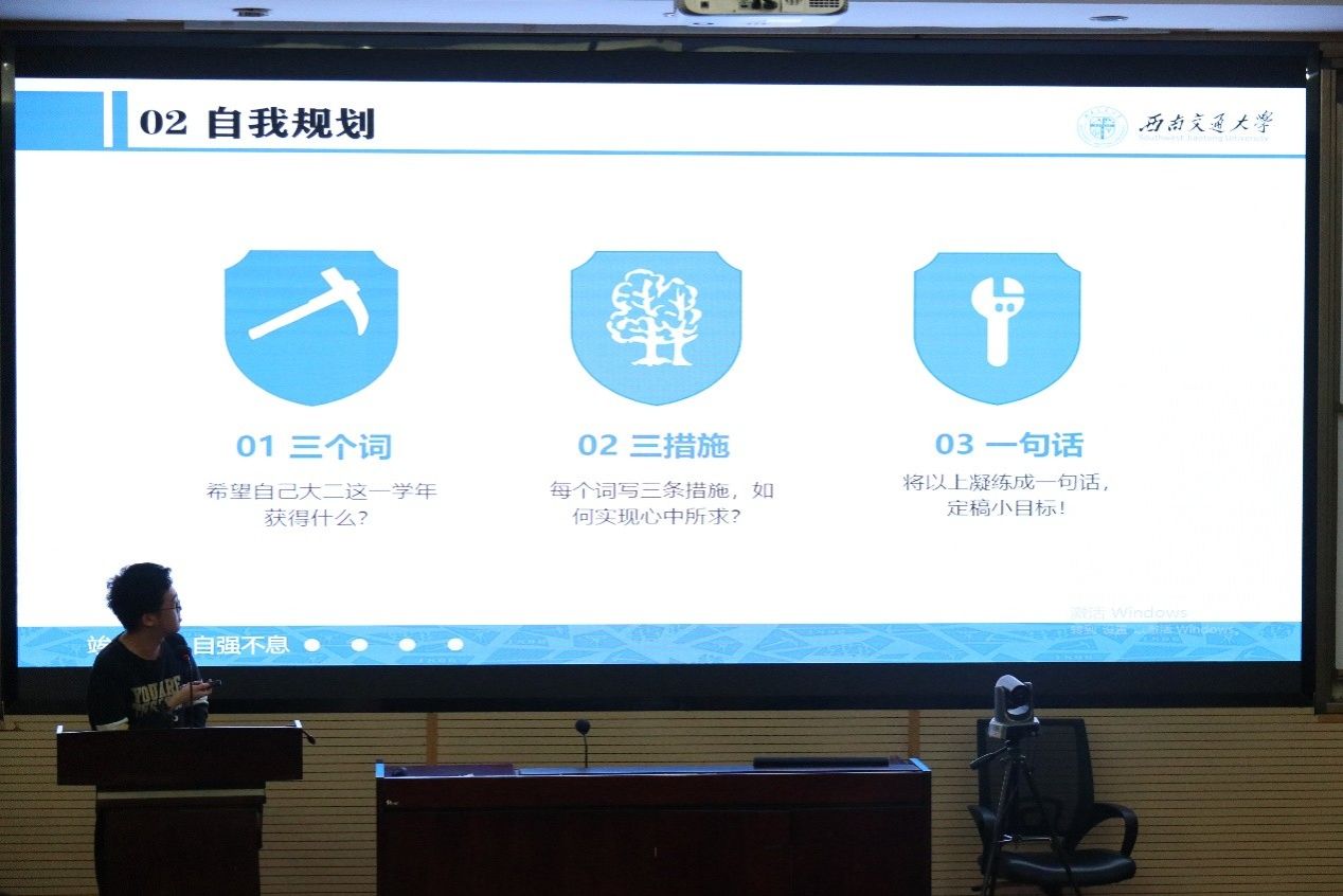 接着,王子琦提到,大一学年对同学们是一个适应的过程,而大二的关键词应是“调整”和“填充”。他以简历制作为切入口,倡导同学们结合自身制定职业生涯规划。并以“139”的小游戏让同学们在纸上写下1句目标、3个愿望、9条措施,从而引发同学们思考在披荆斩棘的一年“该如何规划大二生活”和“大二和大一有哪些不同”等问题。
