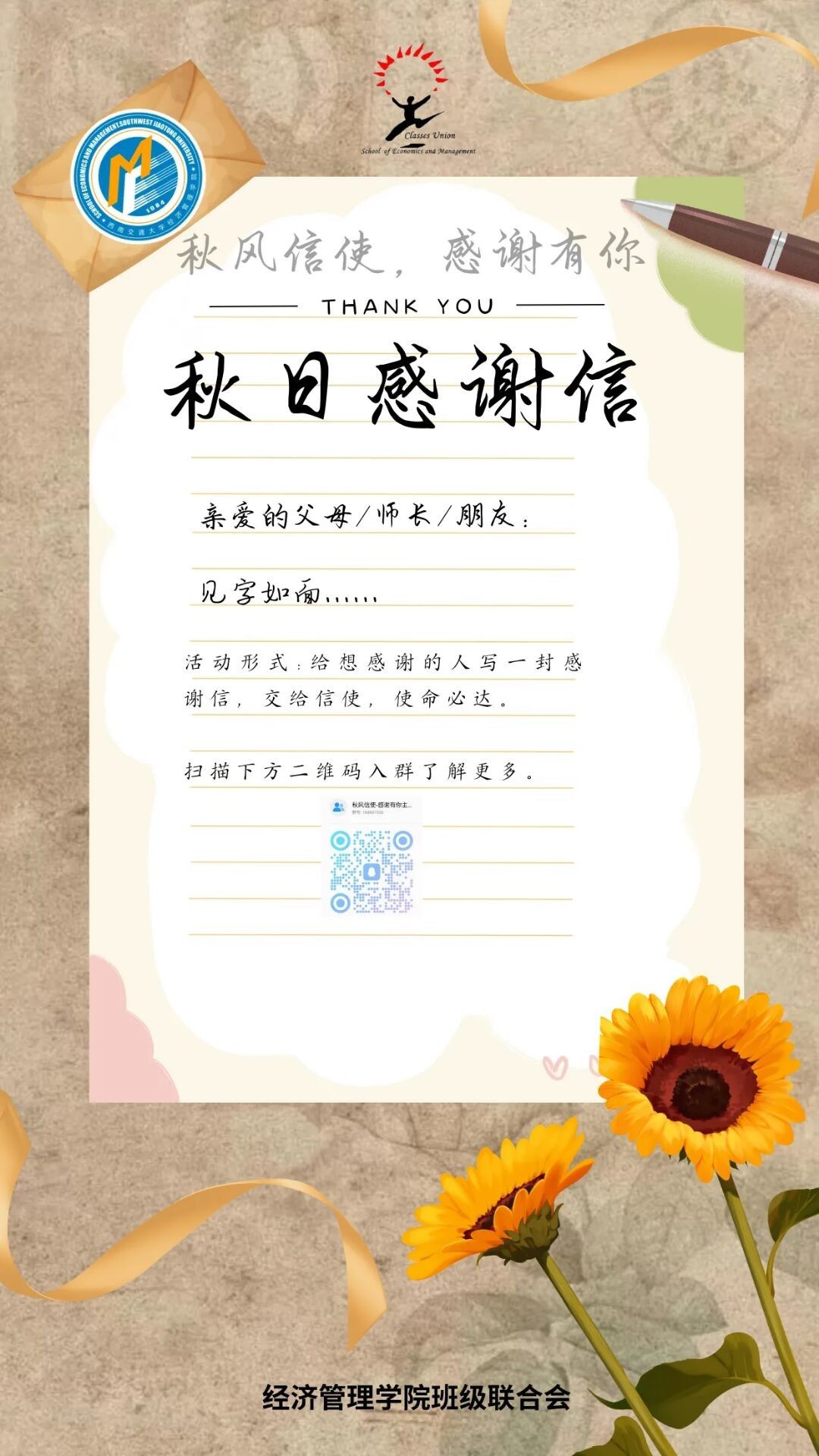 生活中会遇到许多烦恼与困难,这时总有人向我们伸出援手,可能是养育我们的父母、教导我们的老师,也可能是陪伴我们的朋友、朝夕相处的同学,甚至可能是一个陌生人。为帮助同学们传递温暖,常怀感恩,bat365官网登录入口班级联合会10月10日至17日举办“秋风信使,感谢有你”主题心理活动,帮助同学们积极表达、关爱他人,进一步弘扬社会正能量,从而助力同学们的心理健康发展。