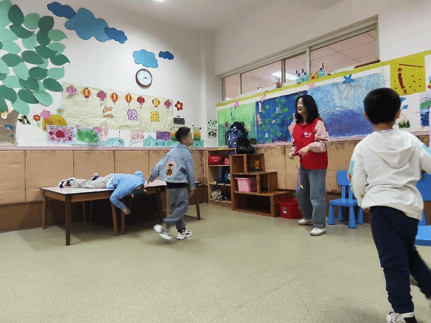 第二组志愿者的任务是协助老师顺利开展音乐锻炼课。在课堂上,孩子们随着音乐的节奏舞动身体,跟随老师和志愿者进行基础训练,包括拉伸、扩胸和下蹲等动作,锻炼他们的手脚协调能力。训练结束后,志愿者还帮助老师给小朋友分发小零食和温水。小朋友们非常有礼貌,向老师和志愿者表示感谢,志愿者们也感到非常温暖和满足。