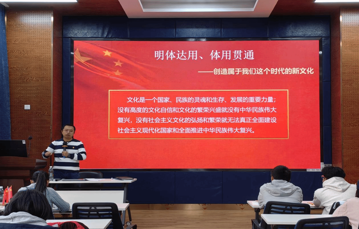 2023年11月22日下午,在西南交通大学九里校区0218,省委宣讲团新时代文明实践宣讲分团成员、西南交通大学青年讲师团成员、信息科学与技术学院团委书记廖凡老师为本科2023级工商管理类6班和经济与贸易类3班进行了《习近平文化思想——为全面建设社会主义现代化国家全面推进中华民族伟大复兴提供坚强思想保证强大精神力量有利文化条件》的宣讲。此外,参加本次学习的还有bat365官网登录入口团委书记贾佳老师、团委副书记苏扬老师。