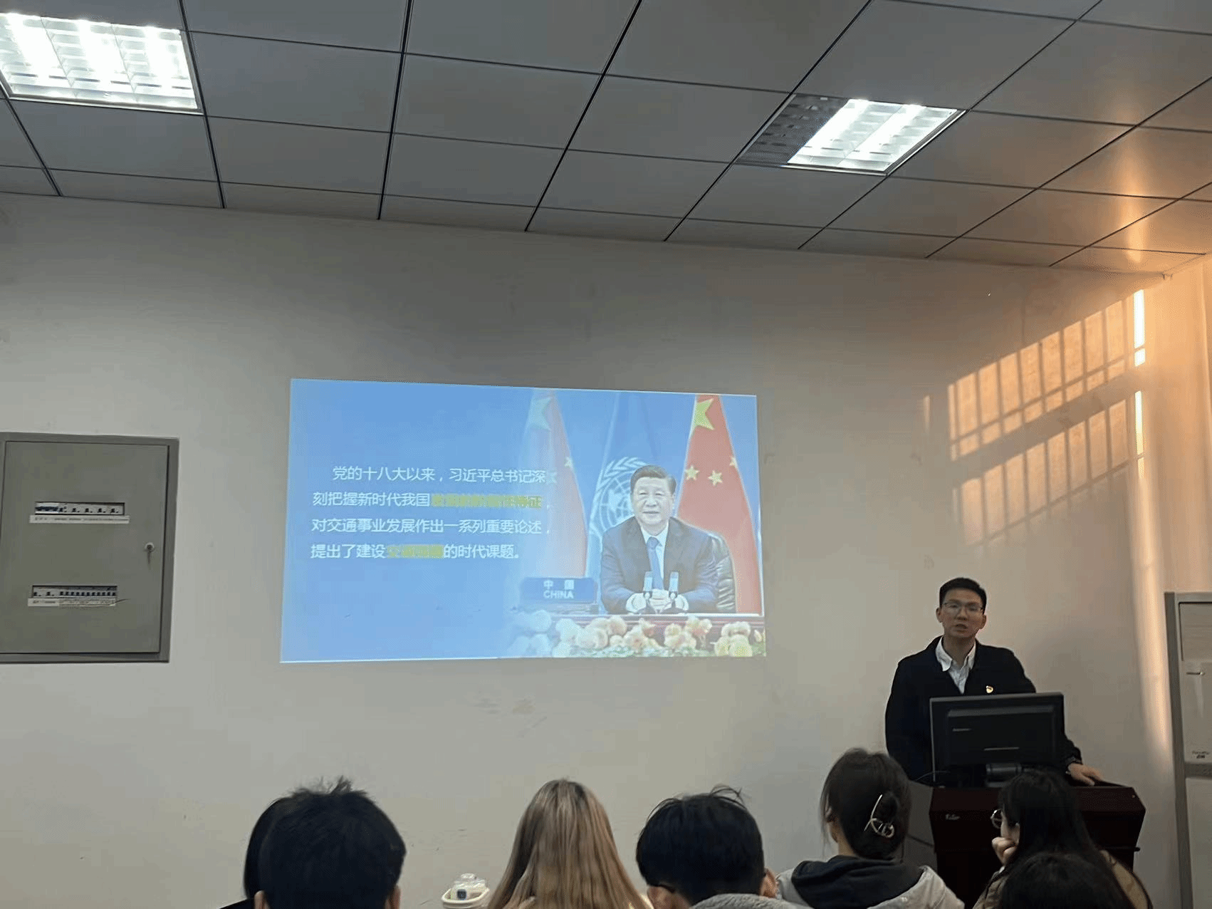 接下来杨都强为进一步贯彻党的十八大以来提出的交通强国时代课题,以“要想富,先修路”的俗语引入对交通科技强国主题的学习。杨都强同志从中国的特殊国情出发,讲述经过一代又一代交通人的努力,从新中国成立之初的交通运输落后到如今令世界惊叹的中国速度,这样的艰辛历程发扬了代代交通人不畏辛劳困苦的精神。其间还向同学们介绍了令人尊敬的翟婉明院士。呼吁身为交大学子的同学们积极参与社会实践活动,并指出实践是深入内心的教育启发的唯一途径。