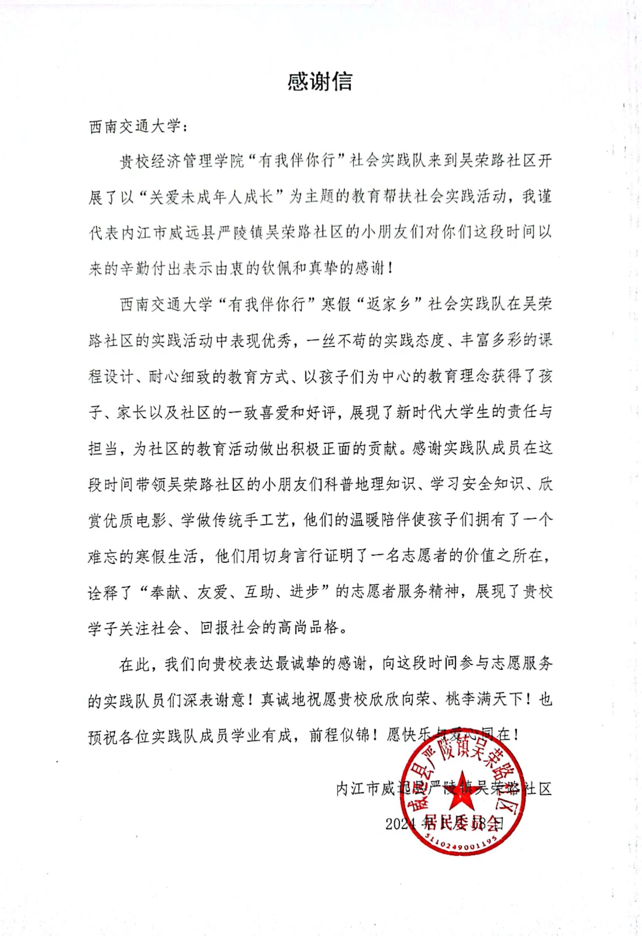 社会实践活动已圆满落下帷幕,但bat365学子参与志愿服务、为社会贡献力量的脚步却从未停歇。通过本次社会实践活动,孩子们在丰富的课程中拓宽了课余知识,培养锻炼了动手实践能力,收获了安全、愉快、充实的假期生活;实践队队员们也通过课程活动拉近了与孩子们的距离,真正做到了暖心陪伴,以青春力量赋能乡村振兴。活动结束后,实践团队收到了来自吴荣路社区的感谢信。