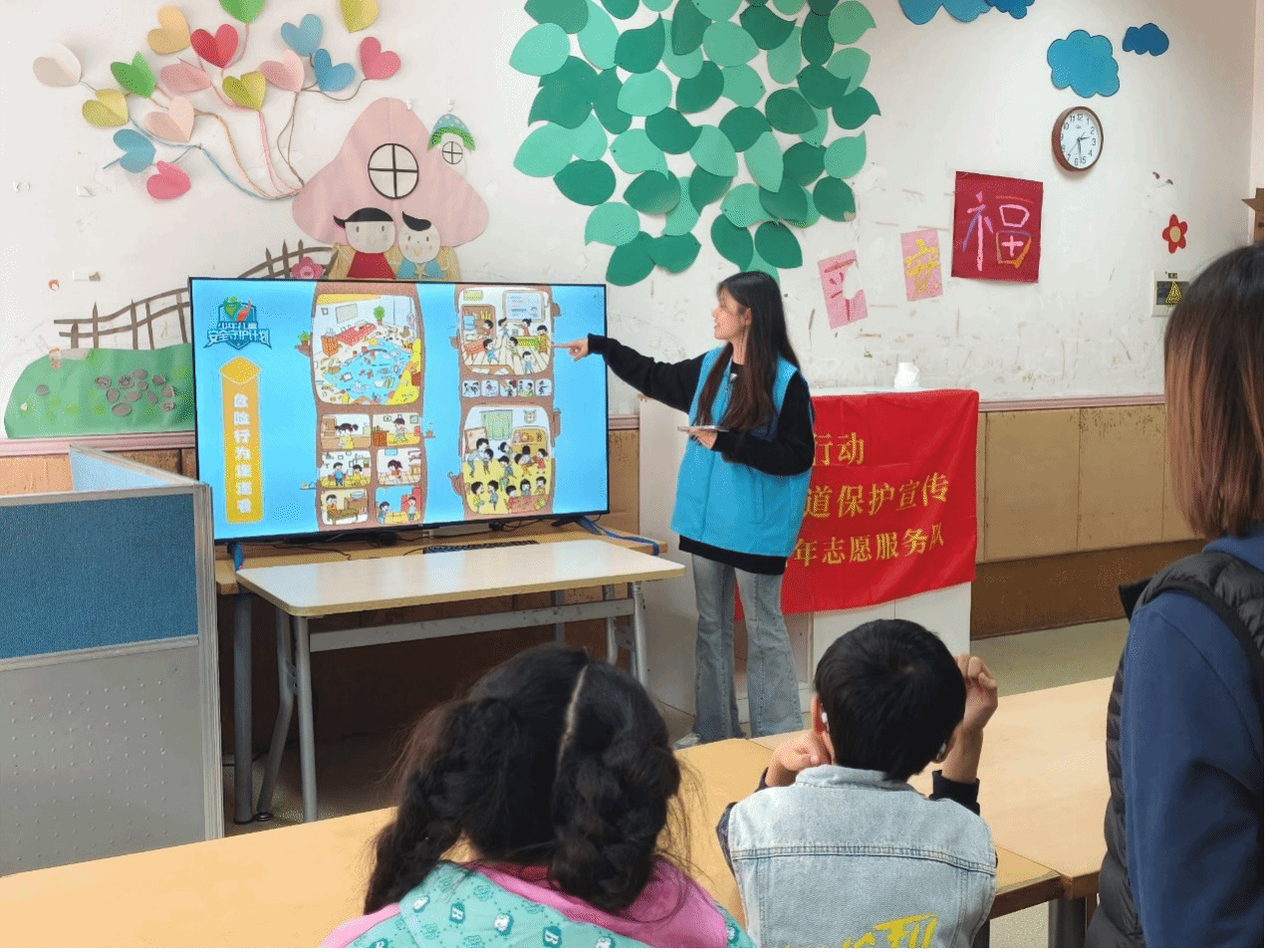 活动面向三个班级开展了各有特色的教育教学活动。对于星光班的孩子们,志愿者们精心设计了一系列既有趣味性又具教育意义的小游戏,孩子们不仅体验了折纸带来的乐趣,还学会了基础的折纸技巧,提高孩子们的专注力;成长班的孩子们则踏上了一段语言艺术、绘画与认知的奇妙旅程。通过聆听一个个引人入胜的故事,激励孩子们用自己的方式去复述故事的情节;通过色彩斑斓的画笔去探索世界的多彩。在学习过程中锻炼了他们的语言表达和逻辑思维能力;职前班的孩子们,志愿者们首先安排了一场关于环保意识的教育课程,让孩子们了解垃圾分类的重要性和实践方法。随后,志愿者们创造性地设置了模拟超市和餐厅等场景,让学员们扮演收银员、服务员等角色,帮助他们更好地了解职场环境,培养必要的工作技能。