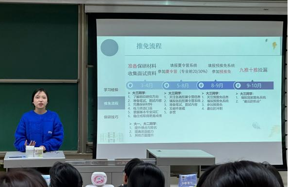 各班邀请的学长学姐结合个人经验,分享了在学习过程中遇到的困惑以及应对方法。工商1班庞硕学长通过时间管理技巧,向同学们介绍了高效学习的策略;管信2班屈睿哲学长和会计1班吴珊学姐、唐同舒学长则围绕保研、考研和留学的时间节点,讲解了如何合理调整学习重心;经济1班吕志冲学长结合自身经验,强调了良好的人际关系对未来就业的重要性;会计1班黄家仪学姐和管信1班黄雅洁学姐和牛韦杰学长则围绕竞赛经验,以就业为导向介绍学习与科研的平衡和规划。朋辈间的交流不仅加深了同学们对未来学习与发展的思考,也激发了大家不断前行的动力,同学们在学术方法、科研竞赛、职业规划、人际关系等方面获得了启发,深刻认识到成长是一个多维度、持续发展的过程。同时,各班还通过组织互动游戏,活跃了气氛,让同学们在轻松愉快的氛围中打破学习的束缚,促进了更为融洽的交流与互动。