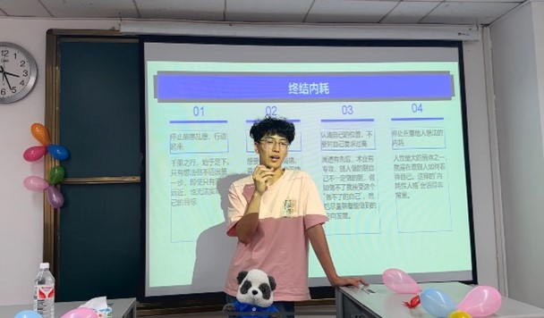 202559日,2023级经济1班举办了一场以停止脑海里的战争——和情绪内耗说再见为主题的班会,由心理委员赵自宇同学担任主讲人,旨在帮助同学们认识情绪内耗,掌握应对方法,促进心理健康。