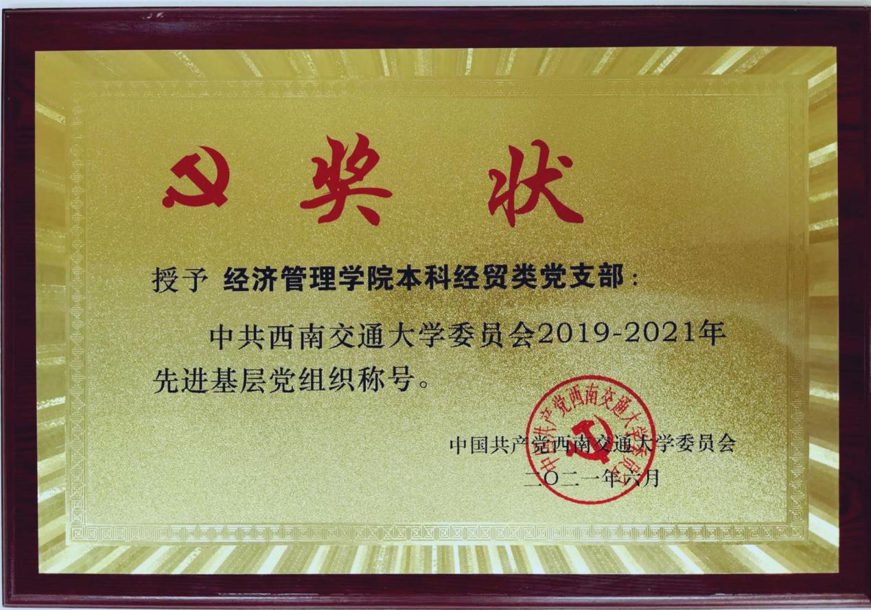 bat365官网登录入口本科经贸类党支部凭借优异的表现荣获“中共西南交通大学委员会2019-2021年先进基层党组织”荣誉称号,作为本科经贸类党支部副书记,薄慧为了党支部的建设贡献了自己的一份力量。