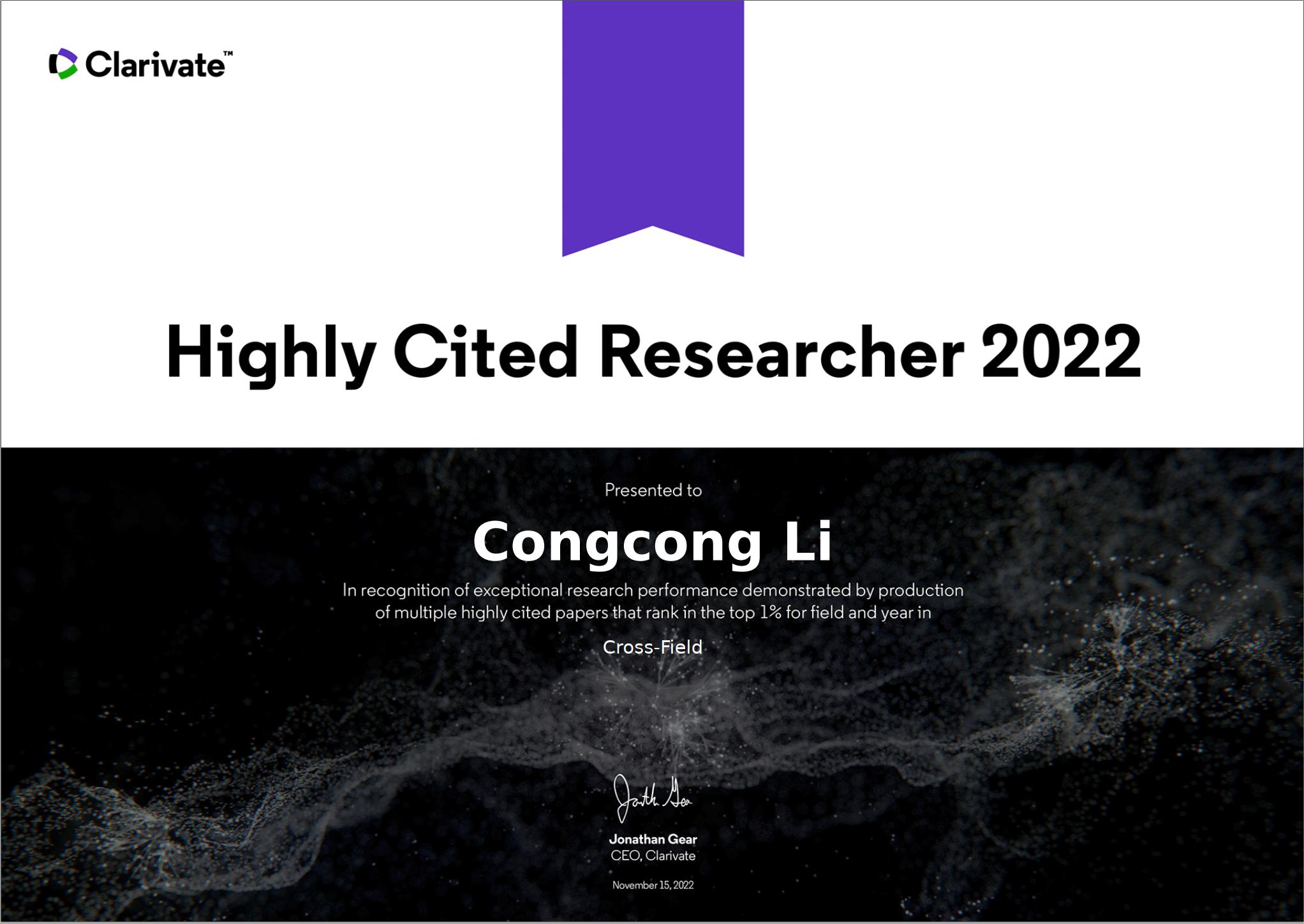 2022年11月15日,科睿唯安(Clarivate Analytics)发布了2022年度“高被引科学家” (Highly-Cited Researchers 2022)名单,来自全球69个国家和地区的6938人入选,其中中国内地的学者1169人。我院信息系统与运营管理系李聪聪老师入选“跨学科领域”(Cross-Field)高被引科学家名单。这是我院历史上第一位上榜的学者,实现了零的突破!