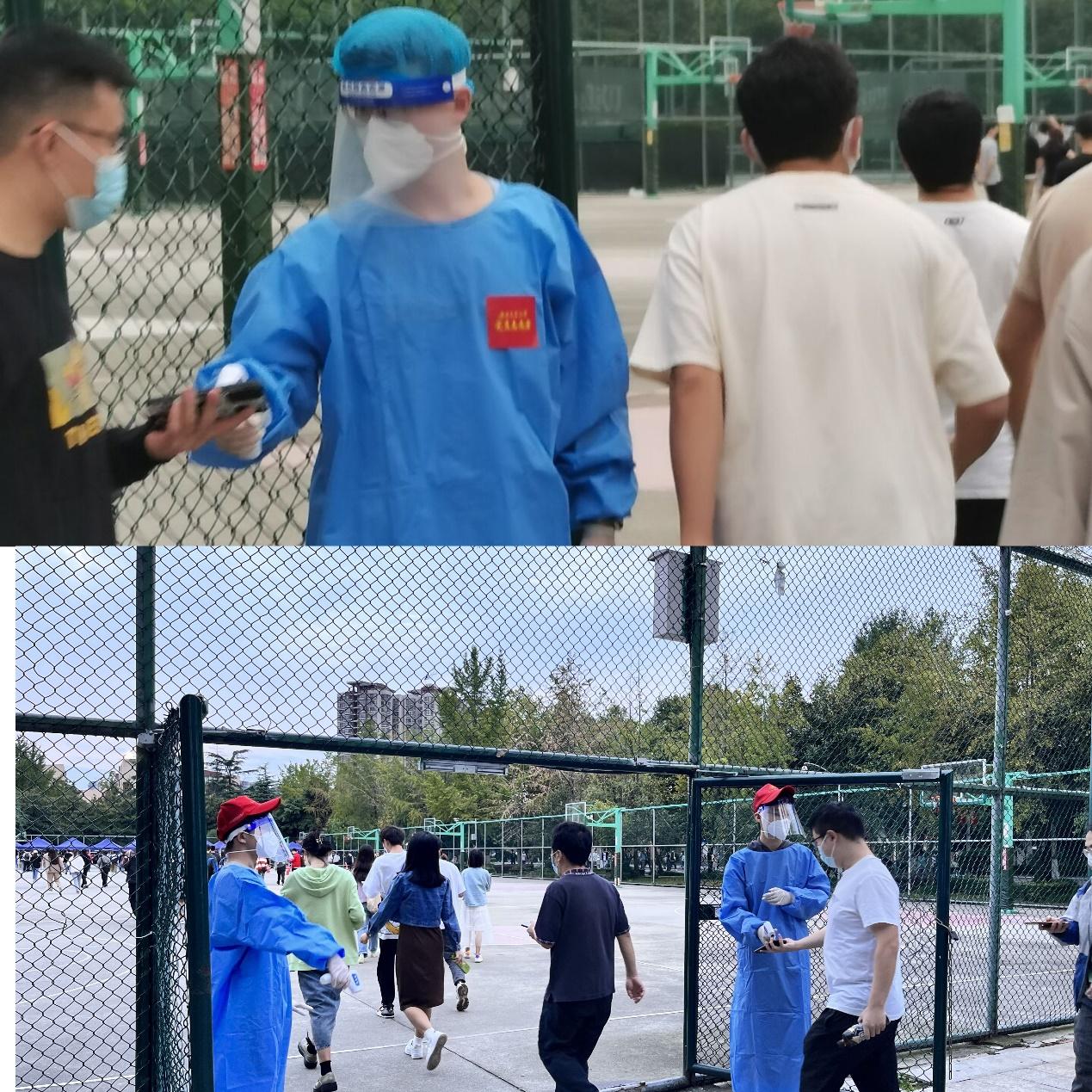 扫码、录入信息、协助医务工作者完成核酸检测,这是党支部党员陈建奇、尹玉萌同志在西南交通大学九里校区的抗疫日常。穿上防护服、打开手机便开始了一天的工作,冗长的核酸队伍,无法停歇的重复扫码,汗水浸湿了衣服,但是,一句“感谢”带来的心满意足和盼望疫情早日消散、重现烟火交大的信念让他们认认真真、毫无怨言。