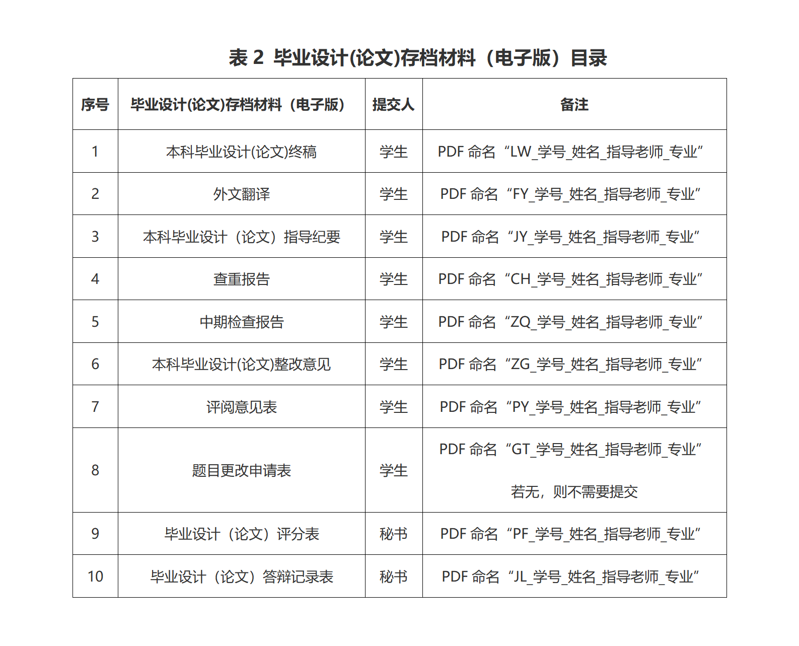 电子版按表2整理后发送至邮箱bkjyzx@126.com,发送同时务必抄送指导老师审核。邮件主题“存档_学号_姓名_指导老师_专业”,附件按表2备注中命名。电子版材料将用于后期毕业设计(论文)抽检工作,请老师同学们高度重视。