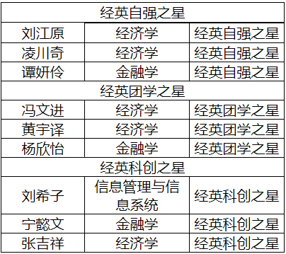 根据《bat365官网登录入口本科毕业生专项表彰评定暂行办法》及学院相关工作安排,经过学生本人申请、学生工作组审核、学院评审小组现场评审,本次评选称号包括经英自强之星、经英科创之星、经英团学之星,根据评选工作相关规定,现将bat365官网登录入口2023届本科毕业生专项表彰获得者进行公示。公示名单如下:
