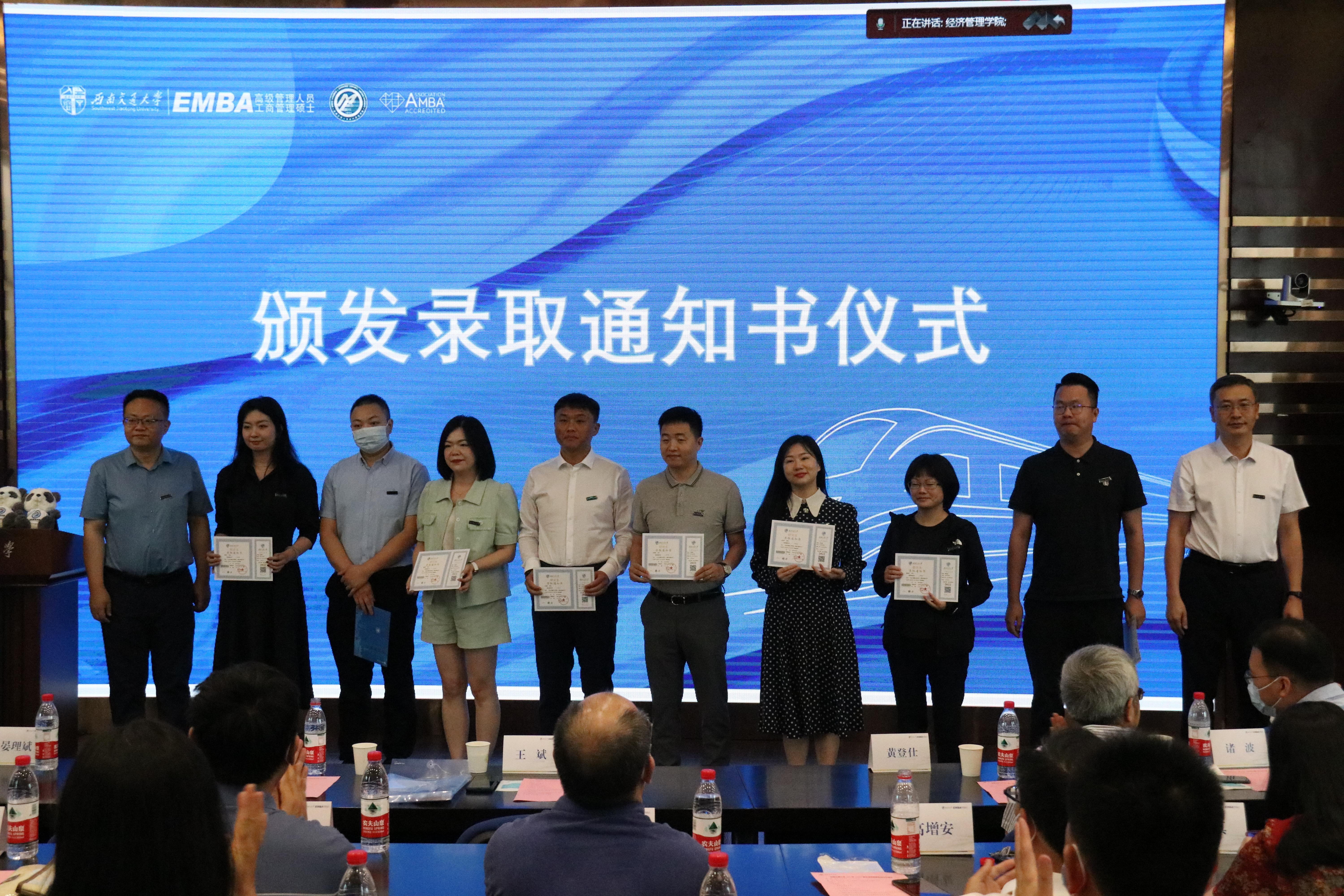 学院老师代表们为2022级EMBA新生颁发了研究生录取通知书。同学们领取西南交通大学录取通知书、佩戴西南交通大学校徽的那一刻,意味着成为了交大的一员,也意味着荣誉、责任和使命将伴随着大家接下来的学习生活,愿新同学们秉持学习的初心,在西南交大扬帆起航,实现新征程新梦想。