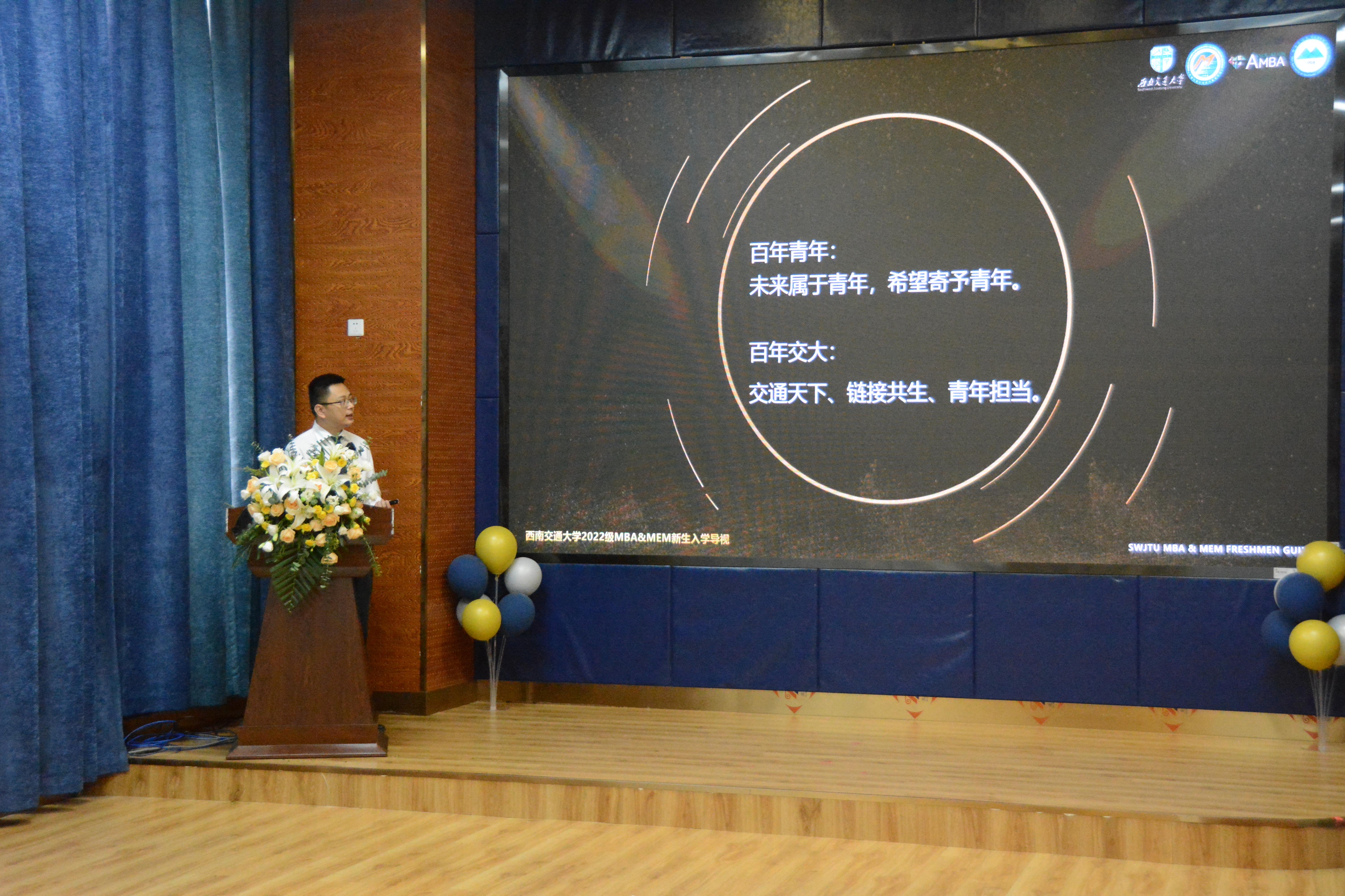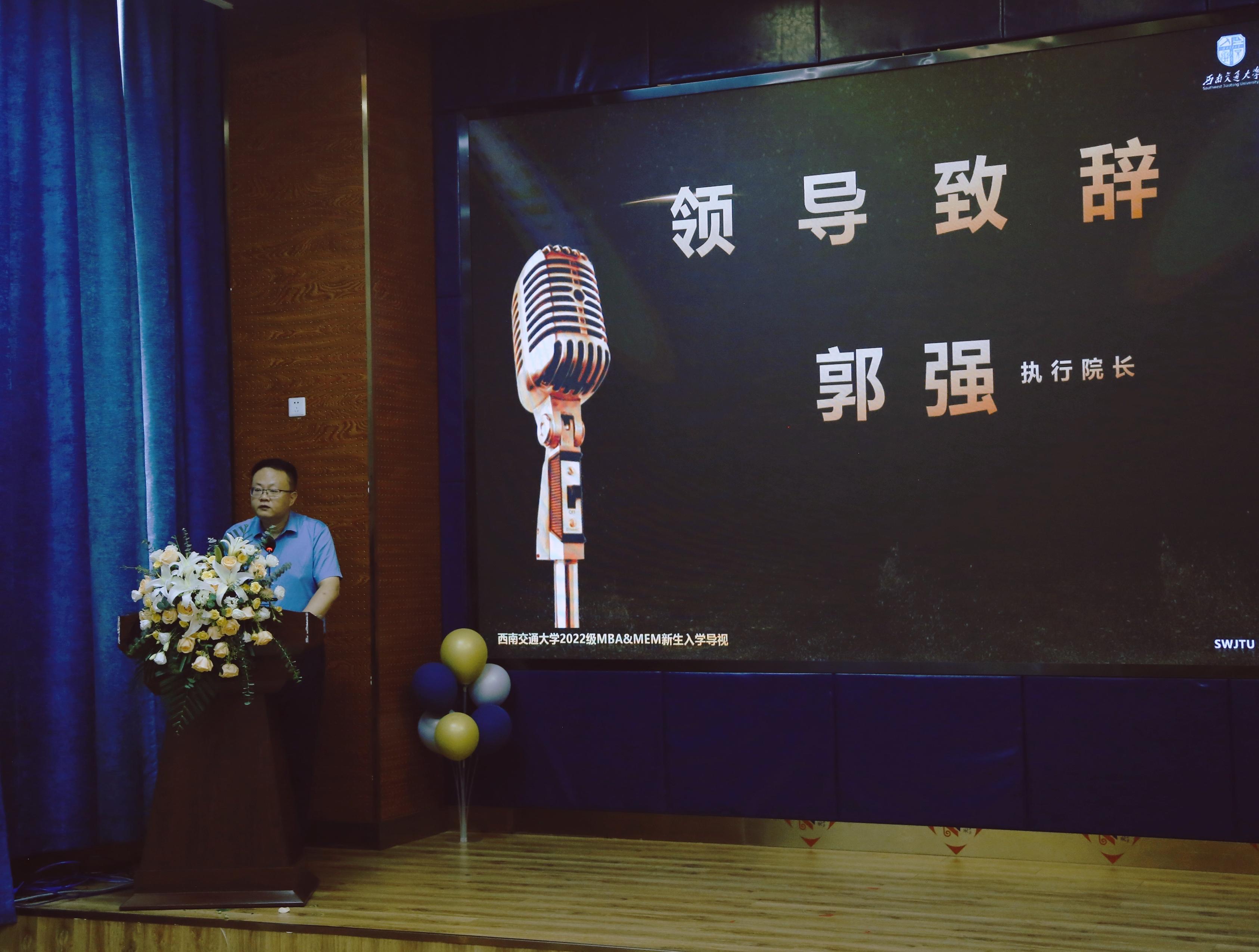 2022年7月3日上午9时30分,西南交通大学2022级MBA&MEM新生入学导视在九里校区0号教学楼218教室举行。bat365官网登录入口执行院长郭强,党委副书记夏显波,工会主席、综合事务办公室主任晏理斌,专业学位教育中心副主任何鹏、诸波,专业学位教育中心办公室主任陈静,学生活动主管袁小容,招生副主管、2022级MBA班主任向洪信,学生事务主管、2022级MEM班主任姚霁芸,招生主管滕倩,教学副主管马广平,MBA学生活动专委会委员张刚、范宇宸、朱琳、曾麟洁,MBA顾问委员会执行顾问范雪鹏、朱劲生、高婧,以及第24届MBA联合会主席团成员出席本次活动。2022级MBA和MEM的500多新生以线上观看直播的方式参加了本次活动。