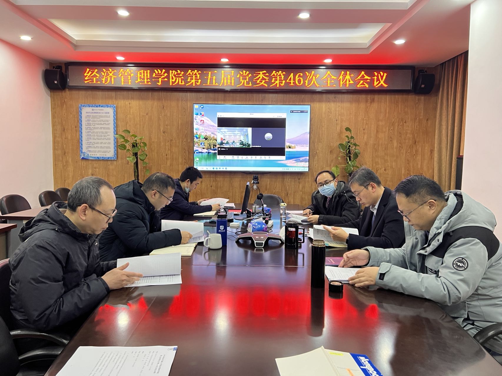2023年1月12日上午9:00,学院第五届党委第46次全体会议在九里校区零号楼0607会议室召开,学院党委书记王斌主持会议。