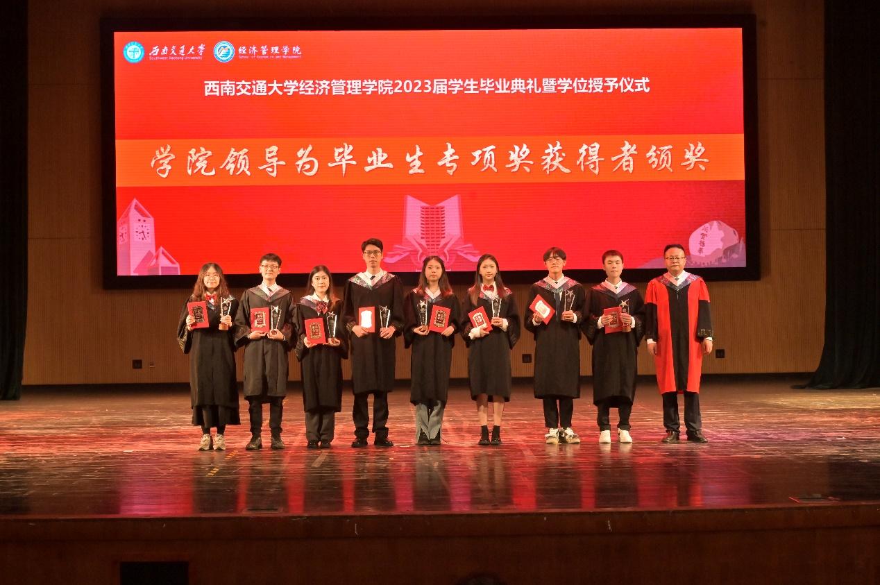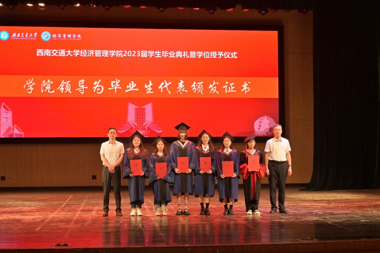 学院党委书记王斌宣读2023届本科生、研究生省级和校级优秀大学毕业生名单,执行院长郭强宣读bat365官网登录入口2023届本科毕业生专项奖表彰名单和2023年MBA、MEM优秀毕业生名单,并由学院党委书记王斌、院长杨平、执行院长郭强为他们颁发荣誉证书。