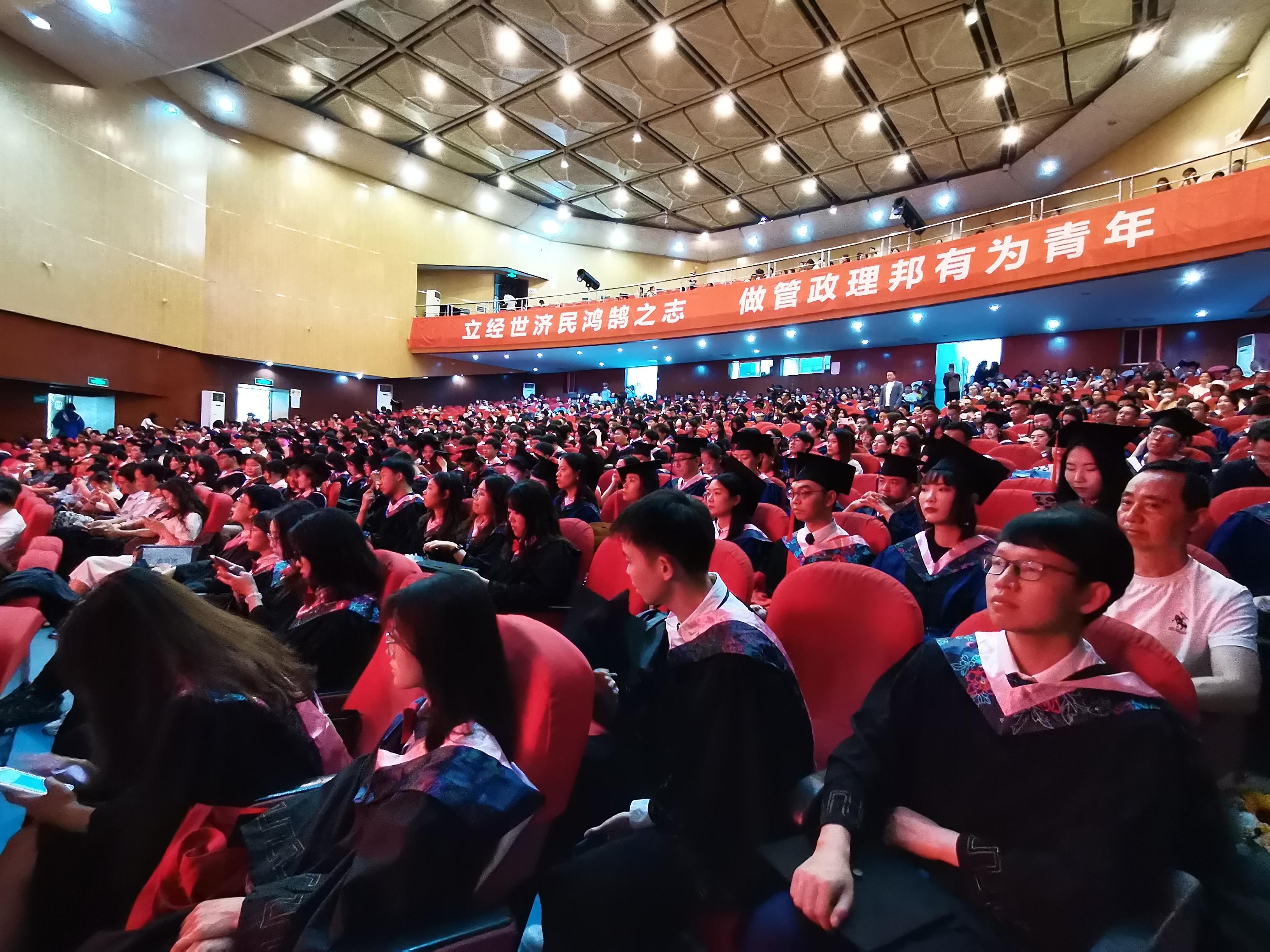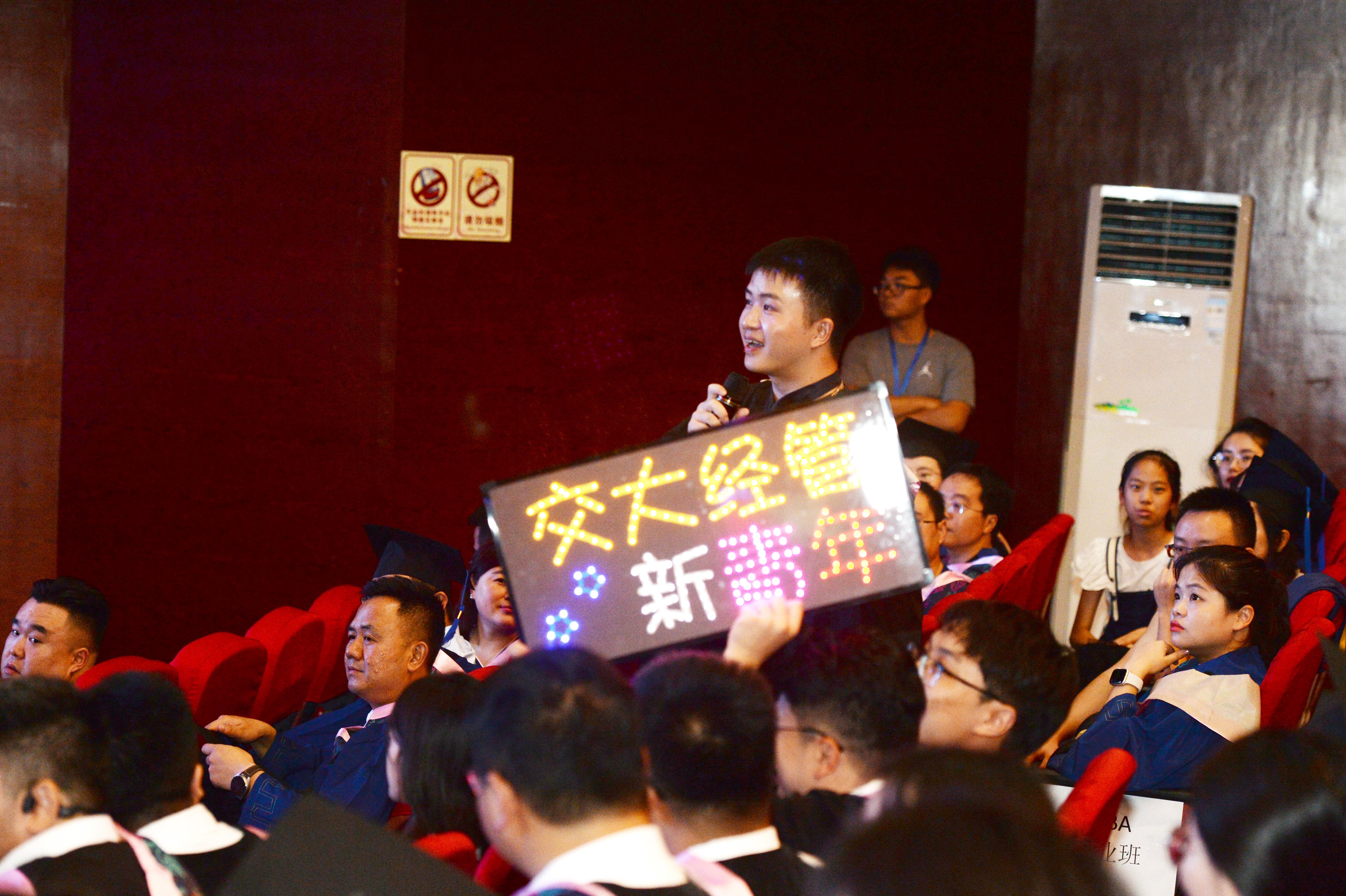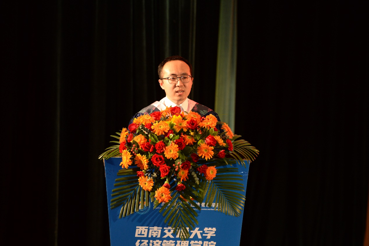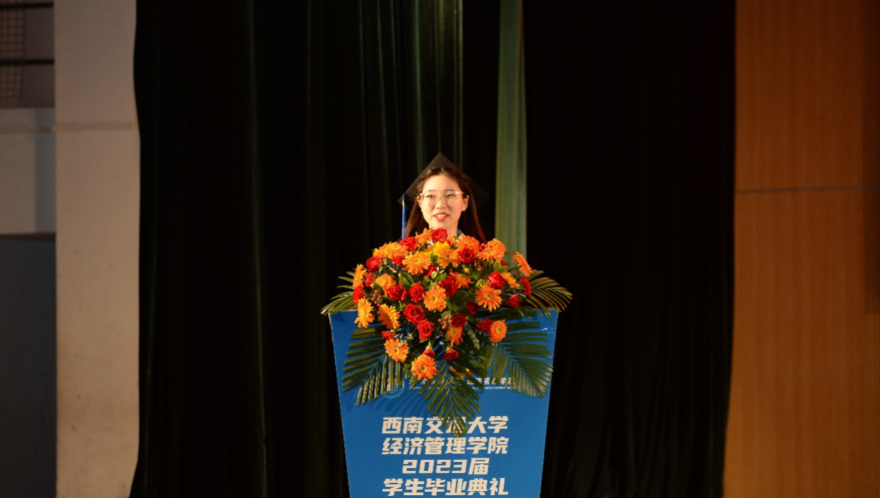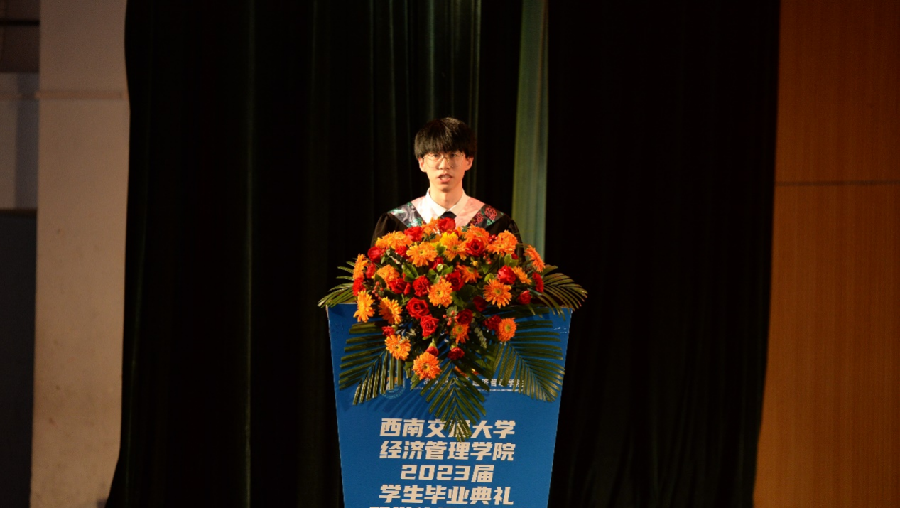 本科毕业生代表贺一鸣、硕士毕业生代表文静柯和MBA毕业生代表范宇宸上台发言,向母校诉说内心的千言万语,深表感恩之情。
