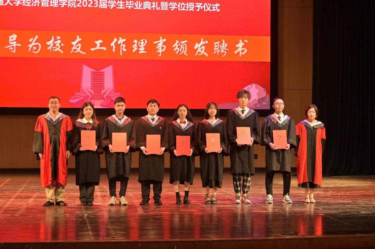 学院副院长周嘉南宣读bat365官网登录入口2023届校友工作理事名单,并由周嘉南副院长、聂佳佳副院长为校友工作理事代表颁发聘书。本科会计学专业2019级2班郭文浩同学作为校友工作理事代表进行发言。他代表全体校友工作理事深情表达了对学校、学院、老师和同学们的感激,表示在未来的道路上,各位校友工作理事将一直铭记“竢实扬华,自强不息”的交大精神,秉持“格物致知,和合共进”的院训,做好校友与学校的桥梁纽带工作,以青春之我在火热实践中绽放绚丽之花。