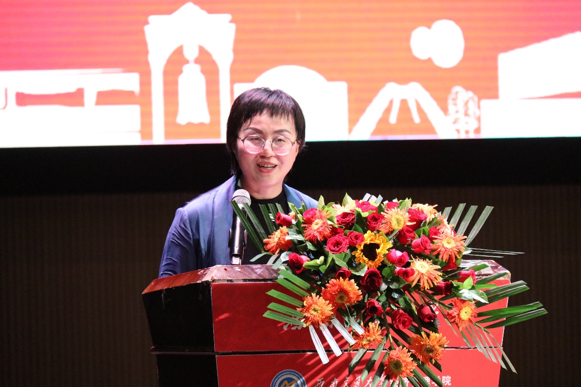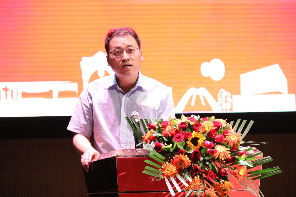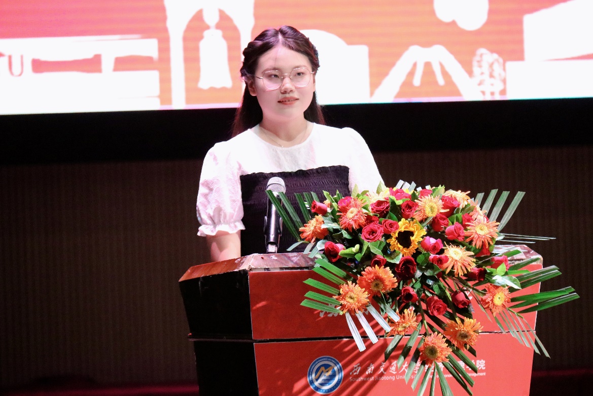 大会第五项,班主任代表李一员致辞。李一员老师结合《一所大学的抗战》,向同学们介绍了西南交通大学与国家民族同呼吸、共命运的非凡历史。对于本科生,她强调同学们要学会自我反思、制定职业生涯规划、积极参与社会活动。对于硕士生及博士生,她希望同学们抓住学习的机会,重新审视定义自己,审视自己和他人、社会以及世界关系。