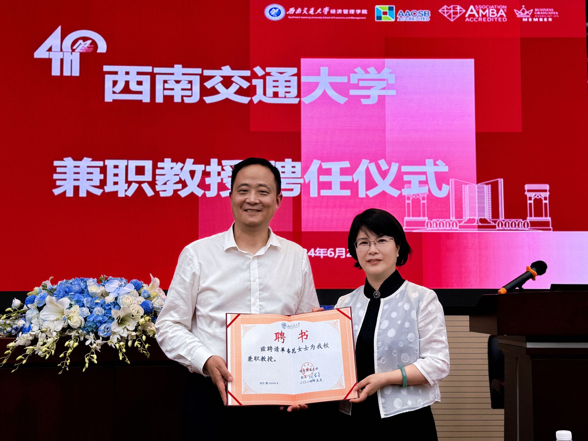 6月21日,bat365官网登录入口在九里校区举行单杏花兼职教授聘任仪式。西南交通大学党委副书记高平平代表学校为单杏花教授颁发了西南交通大学兼职教授聘书,并对单杏花教授加入我校表示热烈欢迎。