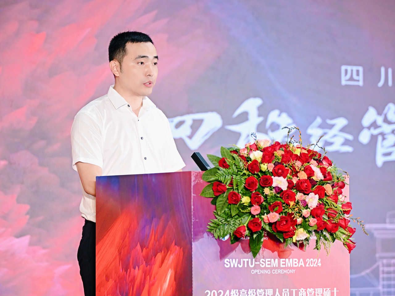 紧接着,杜敏通先生作为EMBA新生代表发言。他代表全体新生向学校和老师表示敬意和感谢,向同学表示祝福和期待。他希望同学们积极学习,不懈努力,争做杰出的企业家和管理者。通过在西南交大的学习,为社会的进步和国家的发展贡献自己的力量。