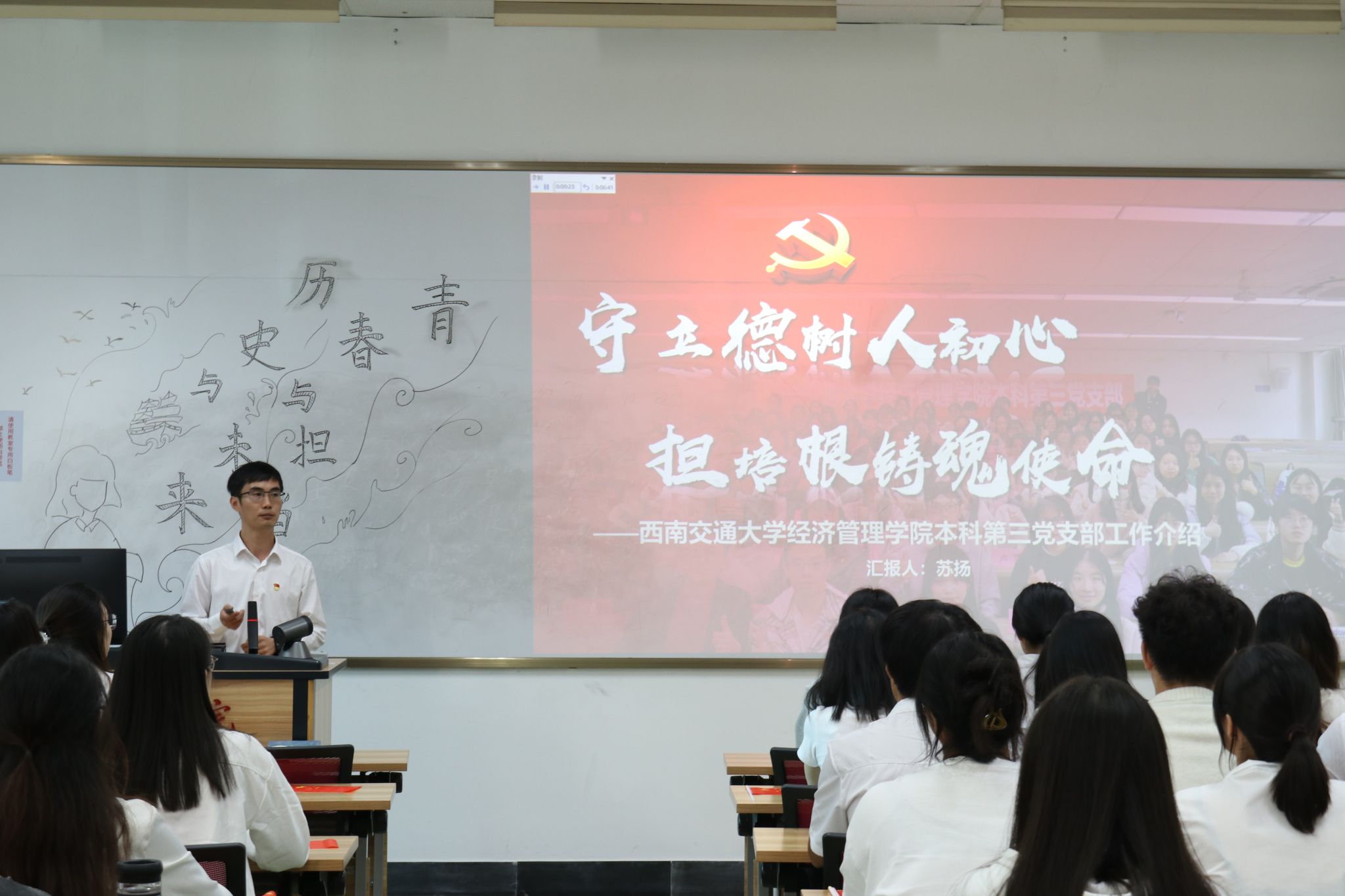 随后,同志们前往川大商学院大楼进行支部共建。川大商学院本科第二党支部书记张宇同志以及西南交大bat365官网登录入口本科第三党支部书记苏扬同志分别针对各自支部的工作特色与亮点进行分享。张宇同志从党建引领学生社区育人新业态和榜样领航青年行、共建一流聚力量两个方面展开介绍了党支部工作;苏扬同志则先简要介绍了西南交通大学校史以及bat365官网登录入口院史,而后分四个方面介绍了党支部的工作方法与支部特色,加深了双方党支部的了解。