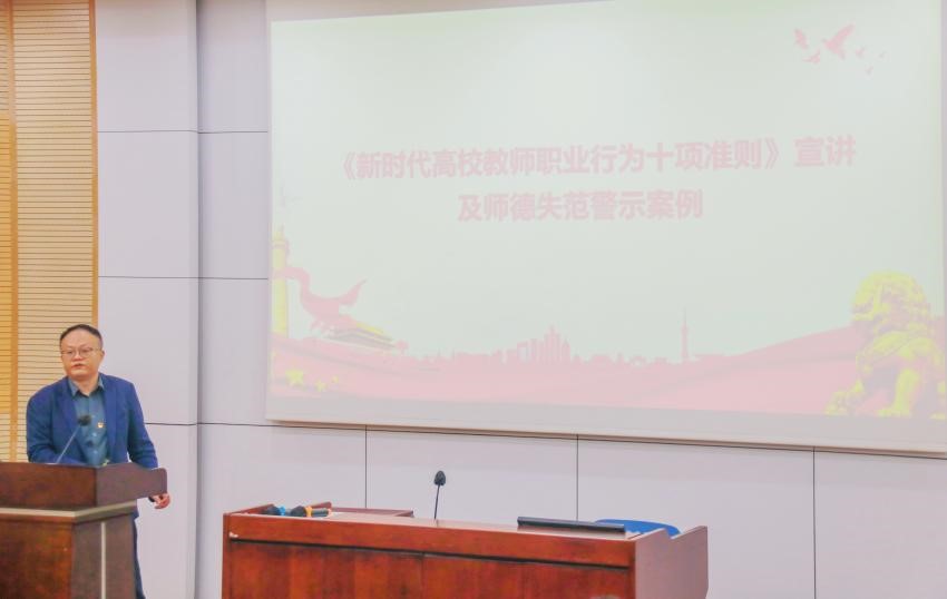 学院党委书记郭强重点宣讲了《新时代高校教师职业行为十项准则》和科研诚信案例,并选取了学校纪委印发的《戒鉴》系列警示教育案例集、教育部党组编写的直属系统违纪违法典型案例汇编《戒尺》等资料中与学院专职教师群体、管理人员群体直接相关的典型案例,进行有针对性的警示教育。郭强强调,全体教职工要以高度的责任感和使命感,提升自身的职业素养和廉洁自律意识。