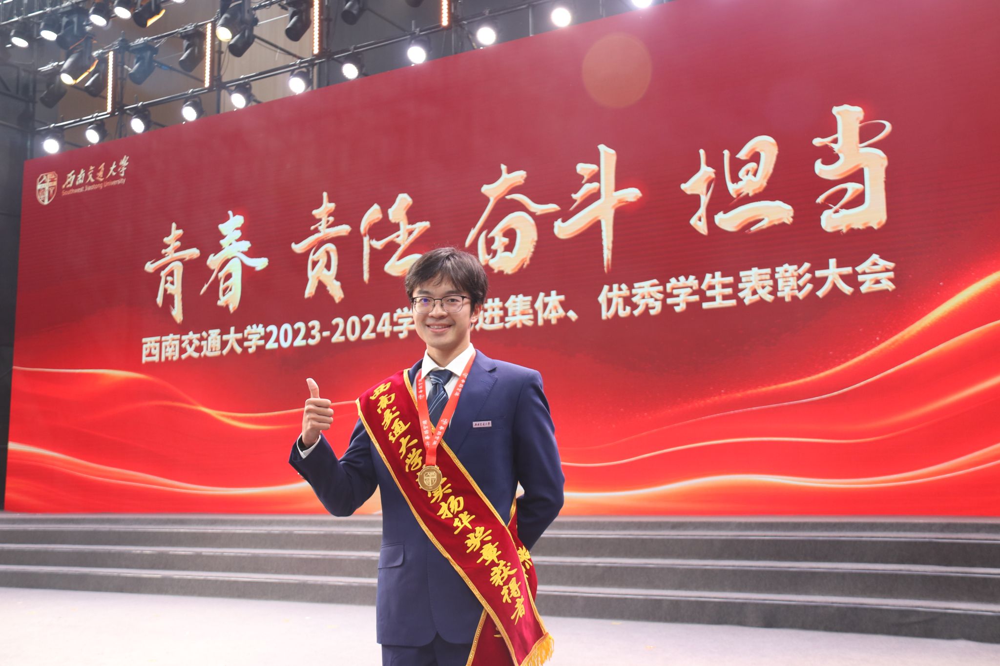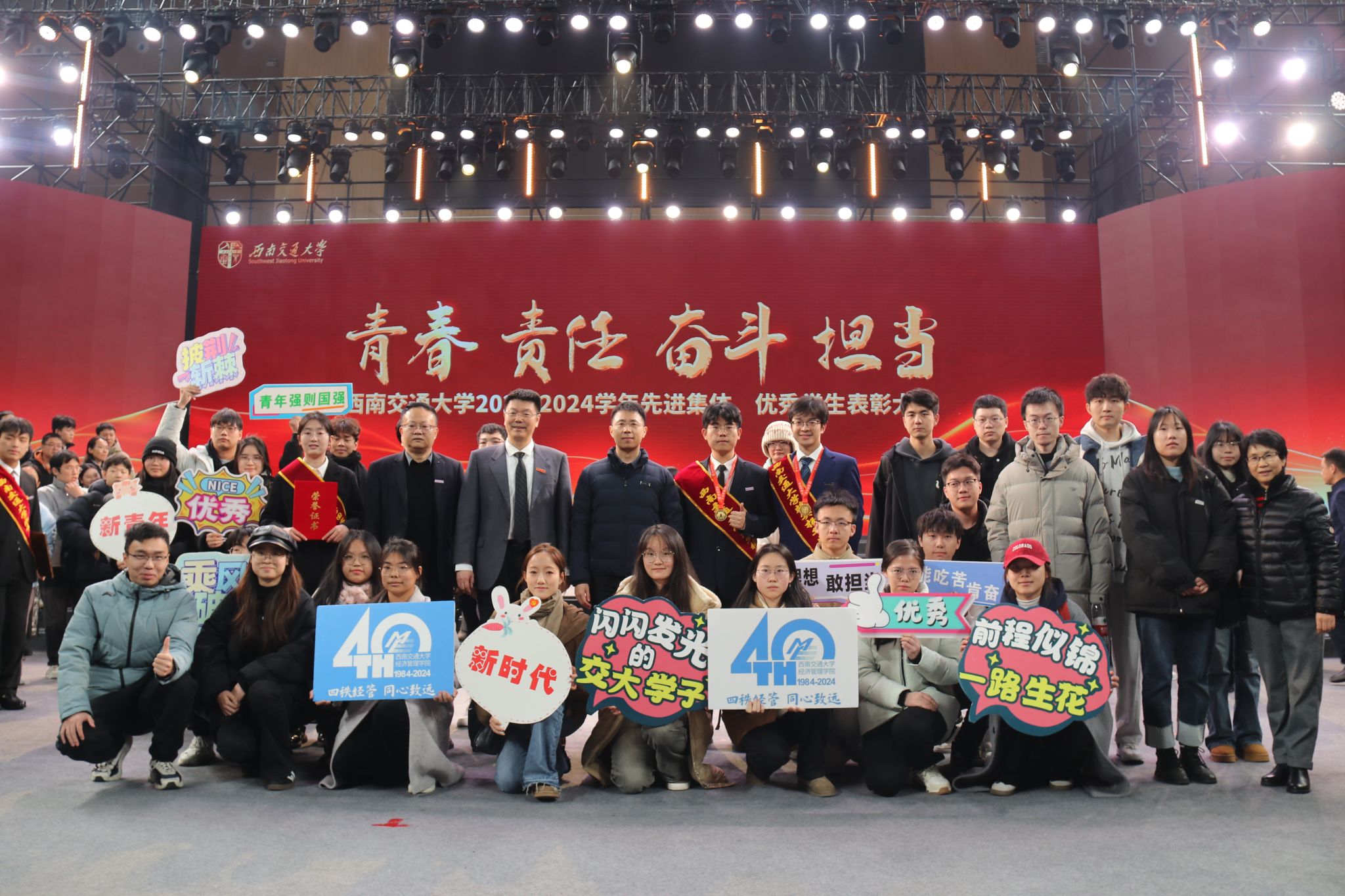 为树立典型、表彰先进,西南交通大学2023-2024学年先进集体、优秀学生表彰大会于2024年12月19日隆重举行,bat365官网登录入口师生代表31人参加表彰大会。2023-2024学年,bat365官网登录入口共计11个班级获评集体荣誉称号,363名学生获评个人荣誉称号,其中2人获评“竢实扬华奖章”(本科生、研究生各1名),366名学生获评各类奖助学金。