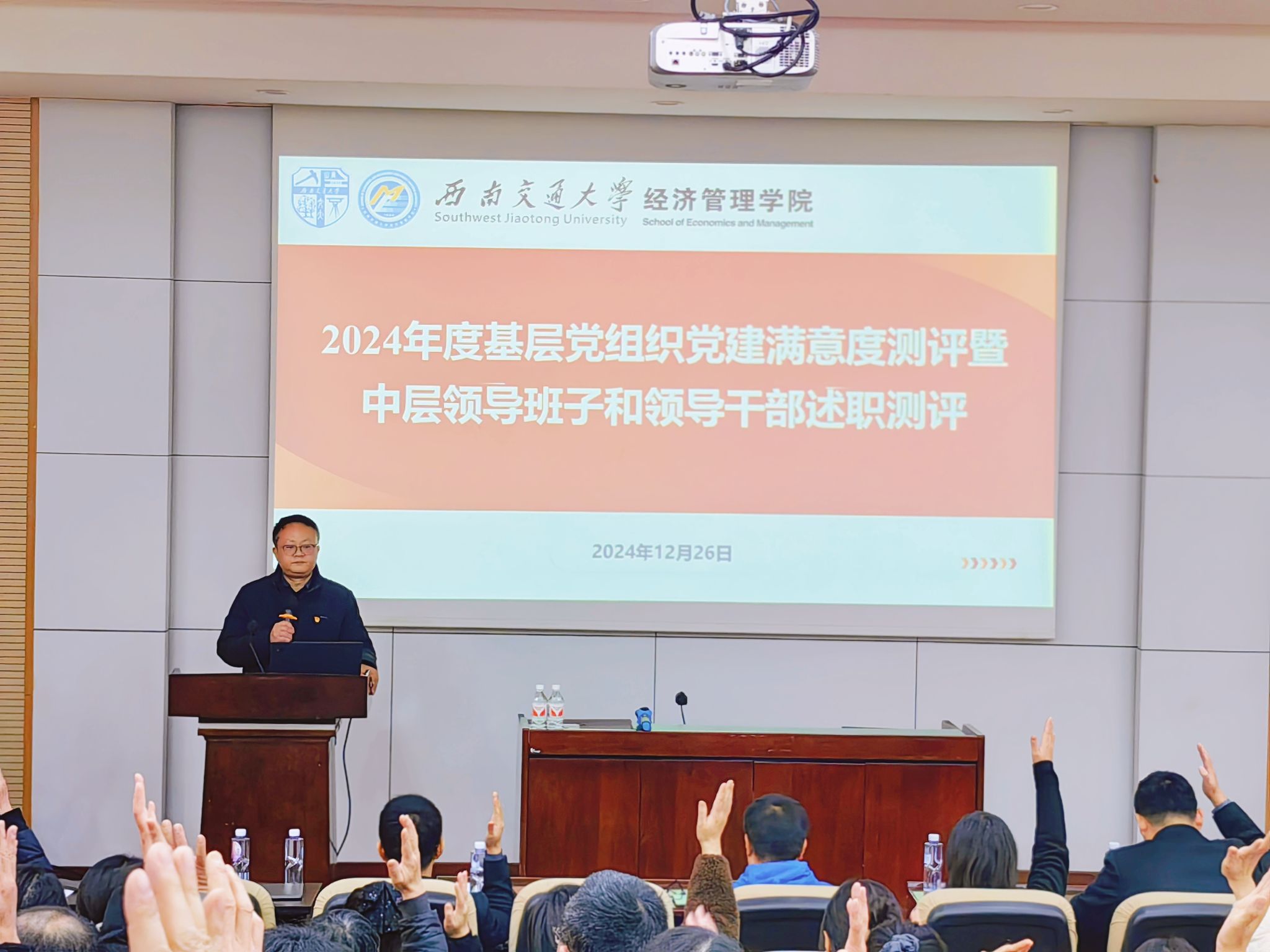 2024年12月26日下午在0215报告厅,按照学校工作部署,bat365官网登录入口召开2024年度党建满意度测评和中层领导干部考评暨2024年双代会。学院党政领导班子全体成员、学院教职工和学生党员代表参加测评,会议由学院党委书记郭强主持。