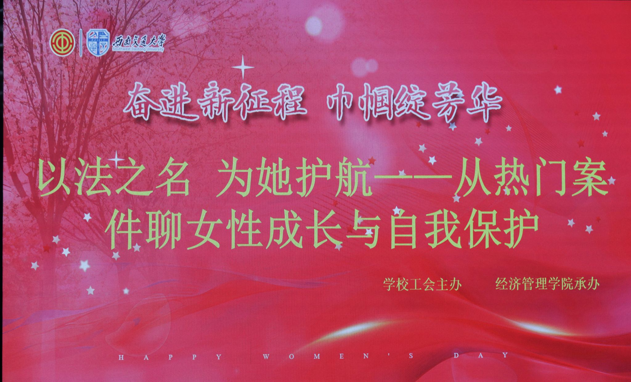 阳春三月,正值第115个国际妇女节来临之日,为提高高校女性教工的法律素养,增强法治观念,促进女性教工群体的法律自我保护意识和能力,2025年3月7日下午2点30分在九里校区0218教室开展了一场“以法之名 为她护航-从热门案件聊女性成长与自我保护”专题分享活动,活动邀请了四川省十佳公诉人、优秀律师蔡蕤洁作主题分享。活动由西南交通大学工会主办,bat365官网登录入口工会承办。