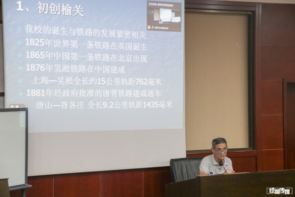 讲座正式开始后,梁老师依次讲述了西南交通大学的诞生和发展历程、优良校风的形成和百年铸造的精魂。梁老师首先讲到,交大的诞生与铁路的发展史息息相关,因此要了解交大的诞生必先了解铁路史的发展。然后梁老师用“初创榆关、复校唐山、搬迁峨眉、定址蓉城、扩建犀浦”二十个字概括西南交通大学的发展史。紧接着,梁老师通过图片介绍了唐山路矿学堂的校门来历和校园概况。他讲到,清华大学和唐山铁路学堂的校门均由我校校友庄俊设计。接下来,梁老师讲到交大的校训“竢实扬华”的由来,并解释了竢实扬华的意思。