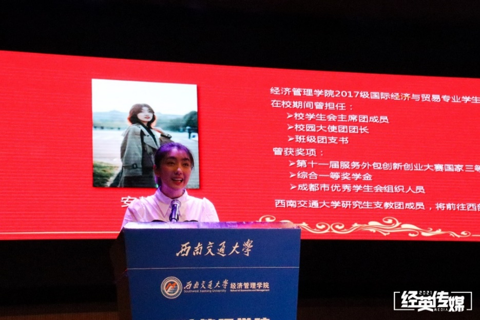 研究生支教团学生代表、2017级国际经济与贸易专业安静泽作了成长报告。她向学校和老师们表达了自己诚挚的感谢,向同学们表达了祝贺与祝福。她分享了自己的大学历程,她说:“一代人有一代人的长征路,一代人有一代人的担当,实现中华民族的伟大复兴路就是我们这一代人的长征路,走好西南交大人的长征路,要永远怀揣一颗努力奋斗的心。”