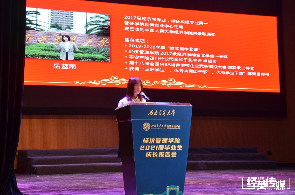 本科毕业生代表、2017级经济学专业岳蓝雨作了成长报告。她回顾了大学四年历程,表达了对学校、老师、父母及同学的感激之情,呼吁青年人应接过时代的接力棒,肩负起祖国伟大复兴的重任,用一生来践行“竢实扬华,自强不息”的交大精神。