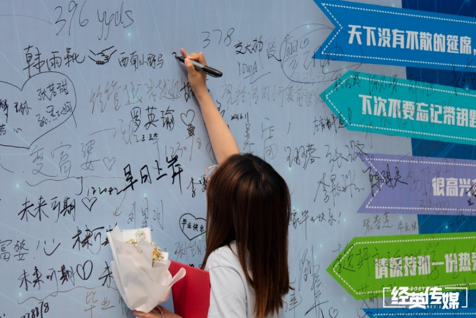 在成长报告会场外,学院还为每一位毕业学子精心准备了留言字板、带有贺卡的花束供大家纪念拍照,卡片上写有毕业生的姓名和对他的祝福。毕业生们也纷纷在留言板上签名,并写下对同学、对自己的祝福语。纵有千言万语,却也无法表达完对学校、对同窗的不舍与眷恋之情,杨柳依依,再漫长的欢聚也总有尽头,再美好的温柔也会消散,但大家对学校的这份情、对同窗的这份念永远不会消逝。
