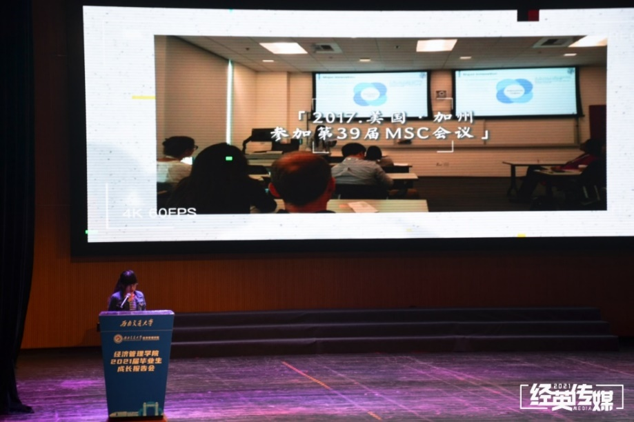 毕业研究生代表、2014级博士研究生贾佳作了成长报告。她向学校和老师们表示了衷心的感谢,向同学们分享自己的求学故事与感悟,告诫毕业生们进入社会后,一定要更加努力。