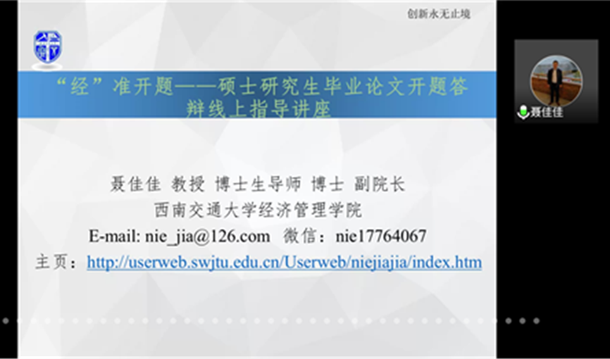 2020年4月16日中午12点30分,由bat365官网登录入口研究生会主办的硕士研究生毕业论文开题答辩线上指导讲座在腾讯会议平台上开展。本次讲座非常荣幸地邀请到bat365官网登录入口副院长、教授、博士生导师聂佳佳与大家进行线上分享和交流。出席本次活动的老师有bat365官网登录入口团委书记、学生工作组副组长贾佳老师,研究生辅导员胡广翰老师和戎尚老师。