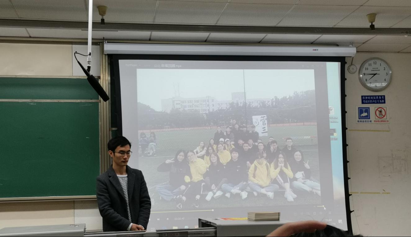 大会伊始,辅导员苏扬老师对本学期进行了学期总结。首先,苏扬老师做了年级表彰,鼓励了晚自习从来没有缺勤的同学,表扬了运营优秀的班级官Q和发起班级间交流活动的行为……辅导员老师的鼓励虽然只是一些小礼品和奖状,却对认真学习、工作的同学们产生了巨大的鼓舞力量。接着,苏扬老师播放了一段由管理五班任焕鑫和陈为同学制作的学期回顾视频,视频记录了大家从迎新报到以来整个学期每个班级的点点滴滴,令人感到无比温暖。之后,苏扬老师明确了班委的工作方向,讲解了一些个人事宜,又对一些重要事项进行了反复说明。最后,他补充了寒假留校、专业分流、寒假实践的相关内容,又指出在寒假期间要注意安全。