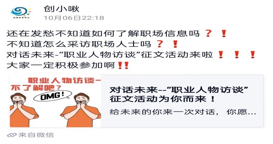 10月15日至10月20日,bat365官网登录入口创新创业中心举办了“对话未来”-职业人物访谈征文活动。职业人物访谈,是通过与一定数量的职场人士会谈而获取关于一个行业、职业和单位“内部”信息的一种职业探索活动,是大学生职业选择和职业定向的一个自助平台,是在校大学生了解和认识社会需求、职业需求、职业环境和基本状况的有效方式。这些信息能够帮助在校大学生正确认识自己的优势和不足,从而制定合理的职业生涯规划。