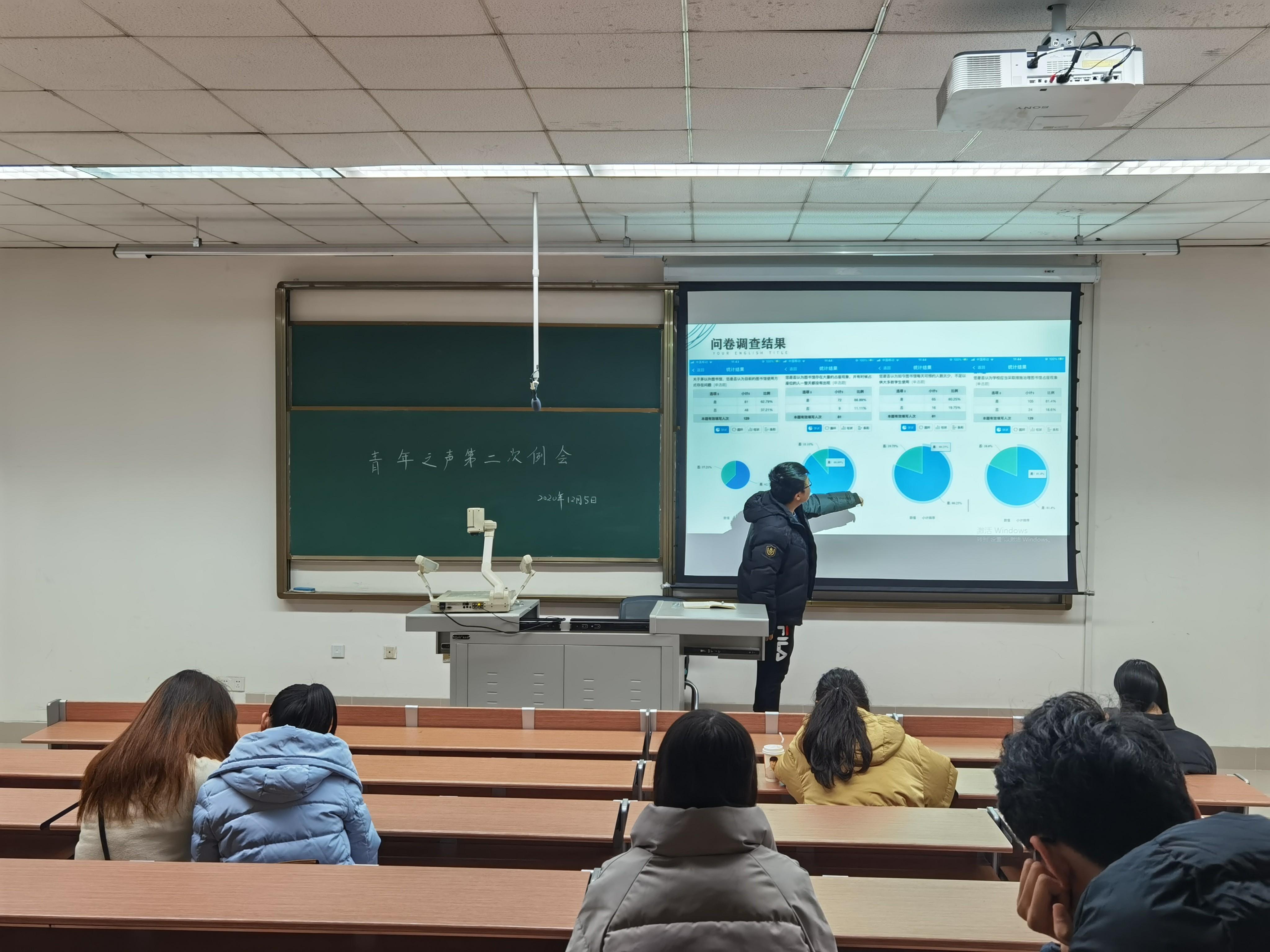 接着,对本月提案调查情况进行了展示,主要内容有图书馆的占座情况以及可供预约人数太少,篮球场和乒乓球台年久失修等。主讲人结合实地走访调查的照片进行讲解,贴近同学们生活的图片使得这些问题的重要性得以突出。最后展示了权益部发起的对同学们的问卷调查,结果以饼状图的方式展现,使得数据更加清晰,也充分体现了此次调查活动的覆盖面之广,调查的民主性,调查结果的精确性。