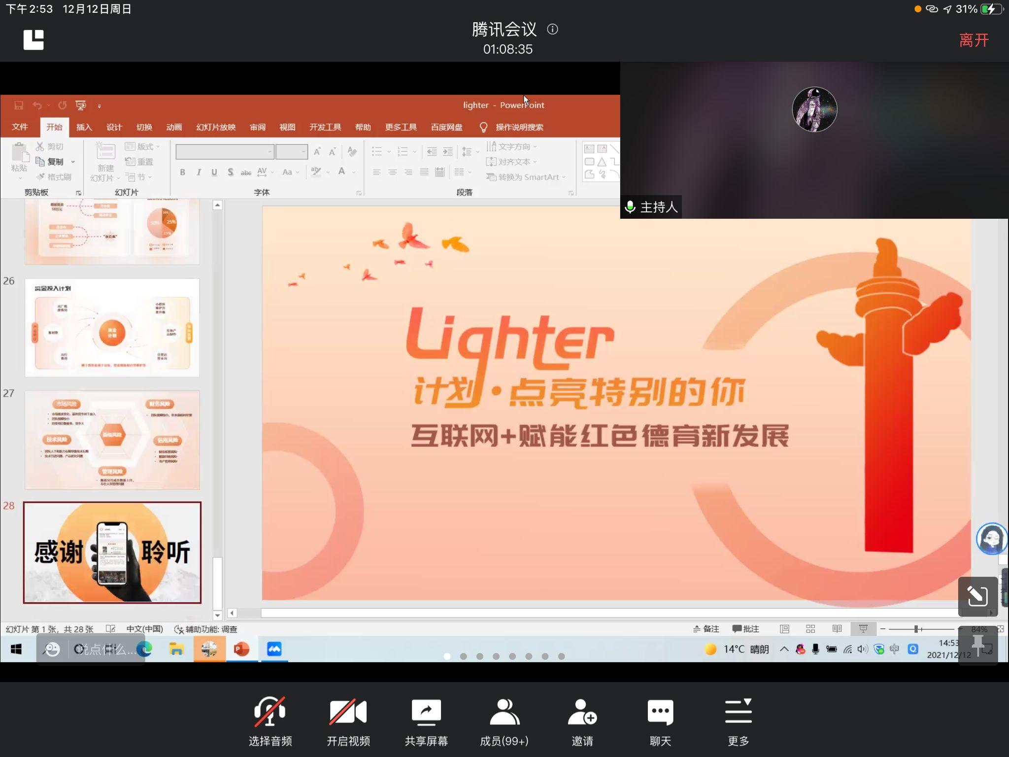 决赛为积极配合疫情防控工作,于2021年12月12日下午2点在腾讯会议线上进行,进入决赛的各队伍通过线上的项目阐述与答辩为各位老师和同学呈现团队的努力成果和项目优势。决赛环节中王一帆老师、范婷老师、敬永春老师和覃蓉芳老师受邀作为评委共同对各项目作出公平公正的评议。11支队伍准备充分,分别从市场需求、市场前景、盈利模式和项目可行性等方面进行了精彩答辩。评委老师认真聆听,给出了许多中肯的建议。最后,旨在采用以呼吸树净化装置为主、路面简易发电装置为辅的模式,来解决当前环境污染问题的项目“呼吸树——智能监测光合照明生态公路网”荣获大赛一等奖。项目“Lighter 计划——互联网+赋能红色德育新发展”和项目“糯米猫直播馆”分别荣获大赛二等奖。项目“花时”,项目“云起时——老年人群生活助手”和项目“Partner”分别荣获大赛三等奖。