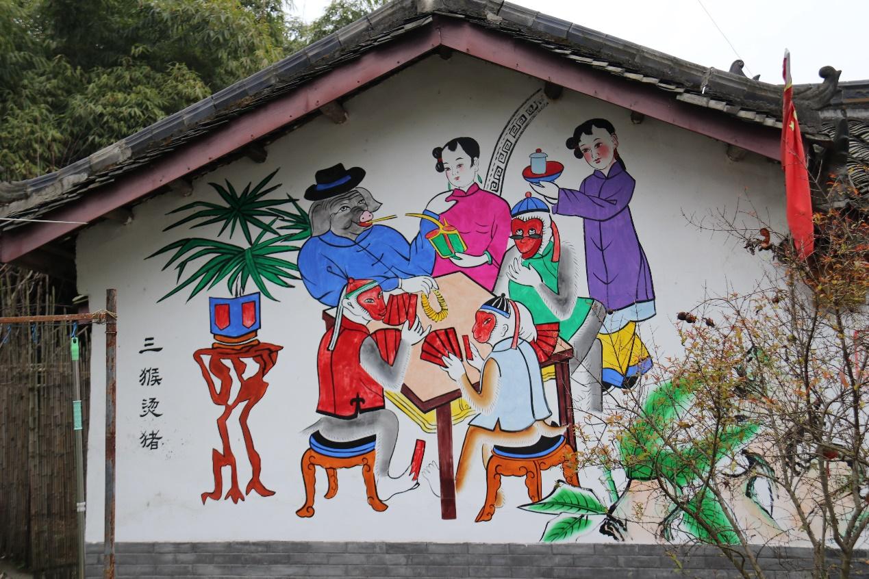 初入年画村,扑面而来的是浓郁的文化气息。家家户户墙上绘制着生动鲜活的年画,从天真活泼的胖娃娃到慈祥和蔼的老寿星,处处展现了绵竹人民的日常生活风貌。绵竹年画展示馆中,每一幅绵竹年画作品都栩栩如生,展现着各自背后的历史故事,从极具讽刺意味的《三猴烫猪》到体现民国女性风貌的《骑车仕女》,绚丽多彩的画卷中体现的是绵竹年画千年传承下所特有的文化厚度与文化底蕴。