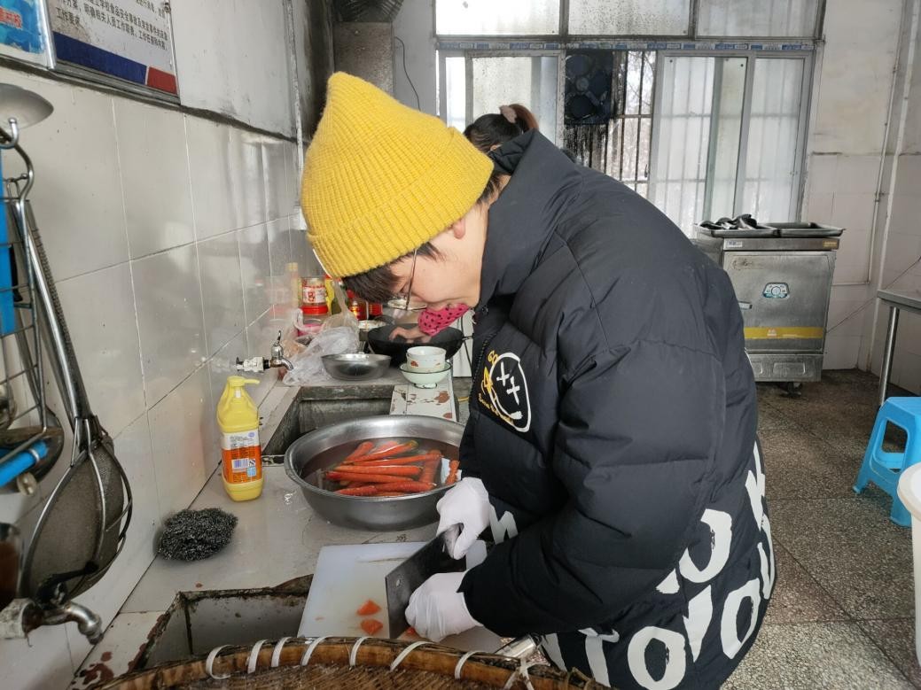 课堂结束后,队员们参观学校食堂,并走进厨间动手为孩子们制作爱心午餐,帮助孩子们打饭添菜。